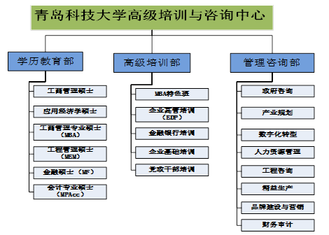 中心目前已形成三大板块:学历教育部、高级培训部和管理咨询部。其中学历教育部包括:工商管理硕士、应用经济学硕士、工商管理专业硕士(MBA)、会计专业硕士(MPAcc)、工程管理专业硕士(MEM)、金融专业硕士(MF)专业硕士;高级培训部包括:MBA特色班,企业高管培训、金融银行培训、企业基础培训、党政干部培训5个基本模块;同时依托经管学院及国内前三咨询机构成立管理咨询部,能够提供政府咨询、产业规划、企业上市、国央企市值管理、人力资源管理、精益生产、财务管理、工程咨询等方面的咨询服务。