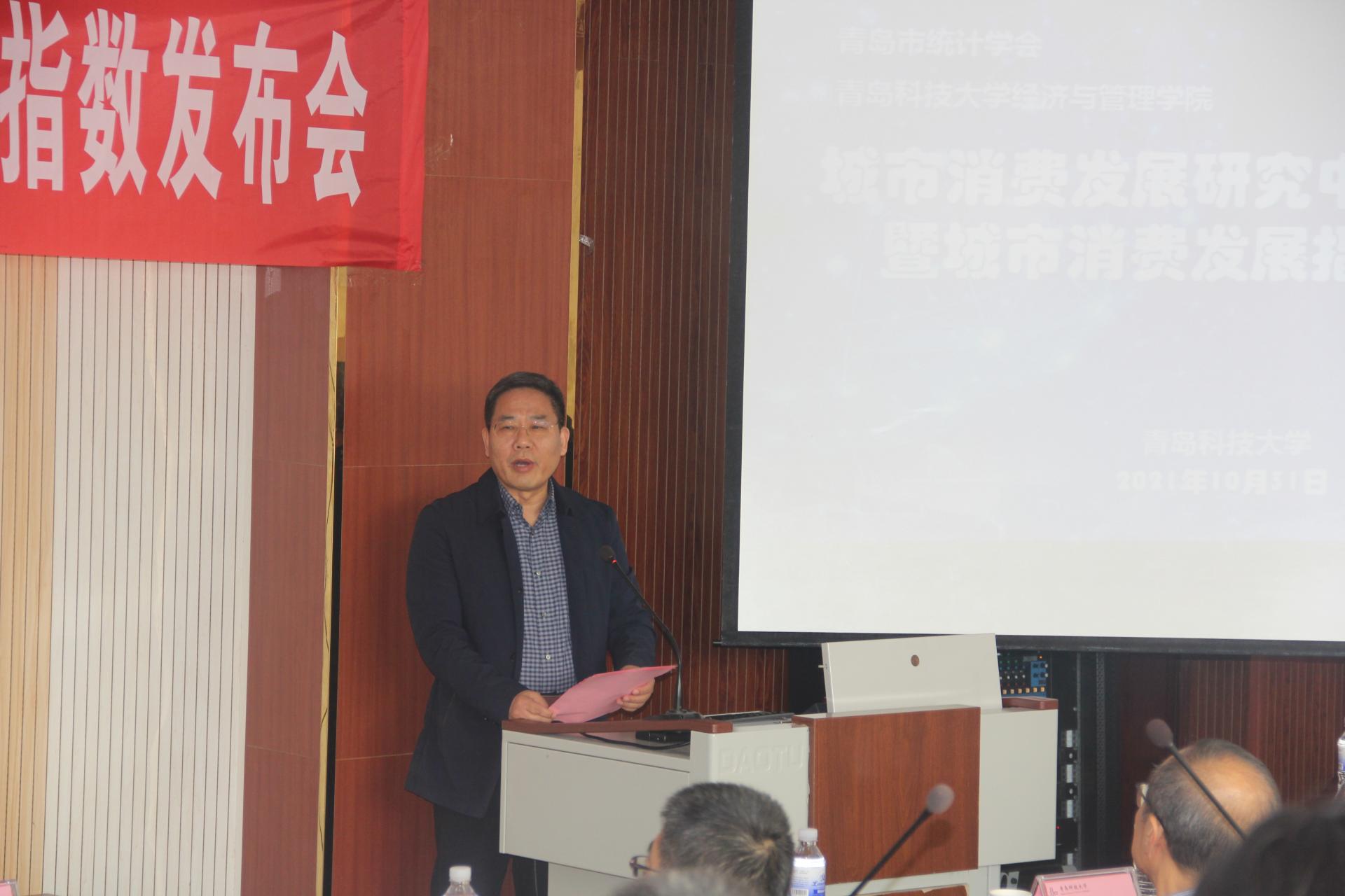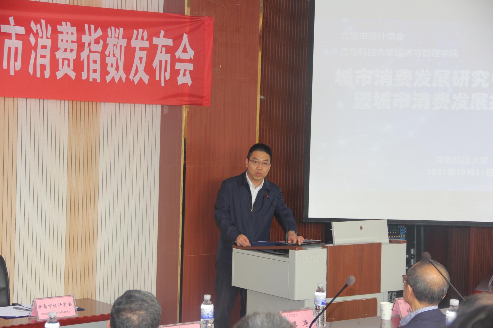10月31日上午,城市消费发展研究中心成立大会暨城市消费发展指数发布会在我校举行,校党委常委、副校长吕万翔出席会议,青岛市统计局党组书记、局长、青岛市统计学会会长刘岐涛,青岛市发展和改革委员会副主任、党组成员、市新旧动能转换综合实验区建设办公室专职副主任张旭东、青岛市统计局党组成员、副局长滕涛,经管学院院长李勋来,党委书记李德成,市直部门相关负责人、企业代表受邀参加会议。
