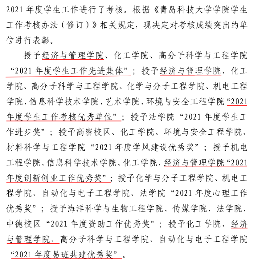 近日,bat365官方官网2021年度学生工作考核结果公布,经学校评价、学院互评和学生评价等环节,我院学生工作再度蝉联全校第一名(连续四年),我院荣获“2021 年度学生工作考核优秀单位”,我院学工队伍获评“2021 年度学生工作先进集体”,同时荣获“2021年度创新创业工作优秀奖”“2021 年度易班共建优秀奖”两个单项奖励。