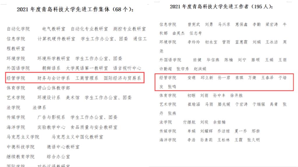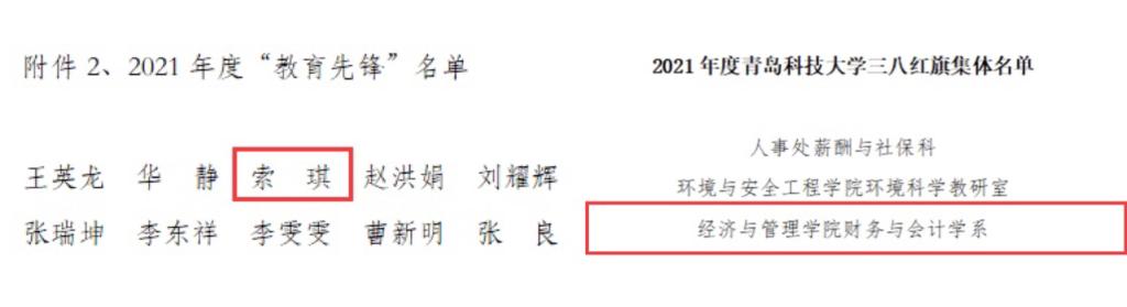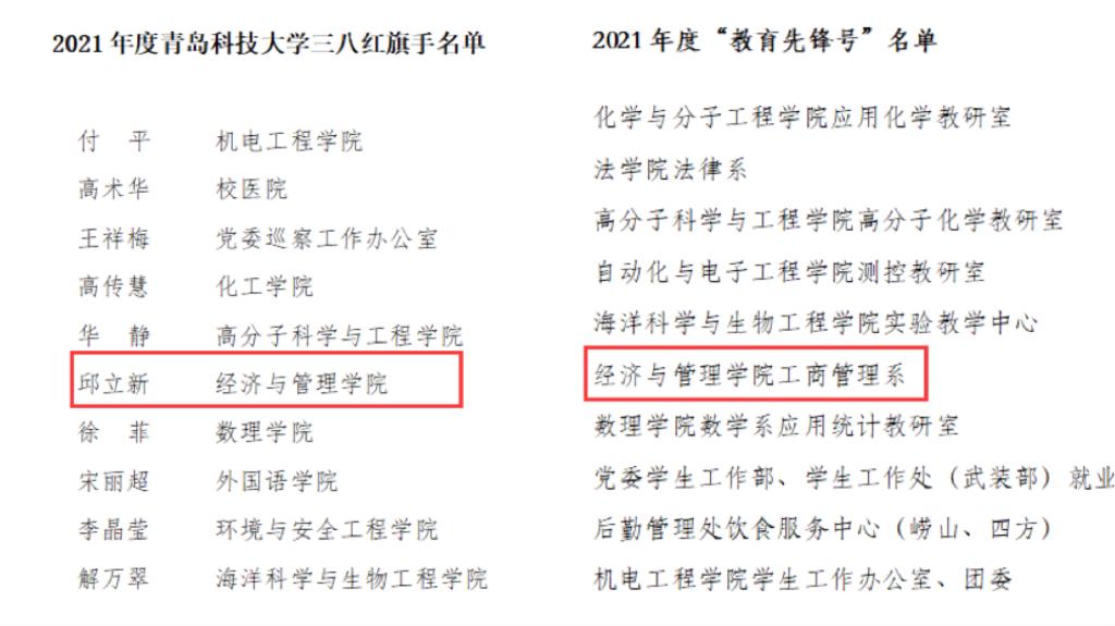 近日,2021年度bat365官方官网先进集体、先进工作者、教育先锋号、教育先锋、三八红旗手、三八红旗集体评选结果揭晓,我院3个集体及8名教师在上述各类评比中均摘得荣誉,其中财务与会计学系、工商管理系、国际经济与贸易系获评校“先进工作集体”,安萌、邱立新、孙一君、索琪、万婕、王春泽、于培友、张鸣老师获评校“先进工作者”,邱立新老师获校“三八红旗手”称号,财务与会计学系获评“三八红旗集体”,索琪老师获评“教育先锋”,工商管理系获评校“教育先锋号”称号。