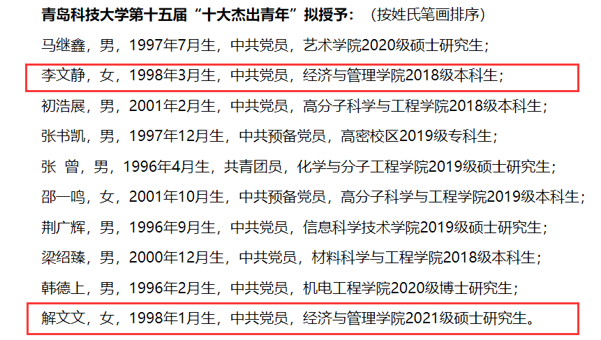 在中国共青团成立100周年之际,为在全校青年学生中选树优秀青年典型,发挥优秀学生在广大青年同学中的模范作用,近期,学校启动第十五届“十大杰出青年”评选活动。根据《bat365官方官网“十大杰出青年”评选办法》(青科大党字〔2008〕12号)的精神要求,经各单位推荐,评选活动组委会相关部门和团委委员评选,我院2021级研究生解文文、2018级本科生李文静荣获bat365官方官网第十五届“十大杰出青年”称号。
