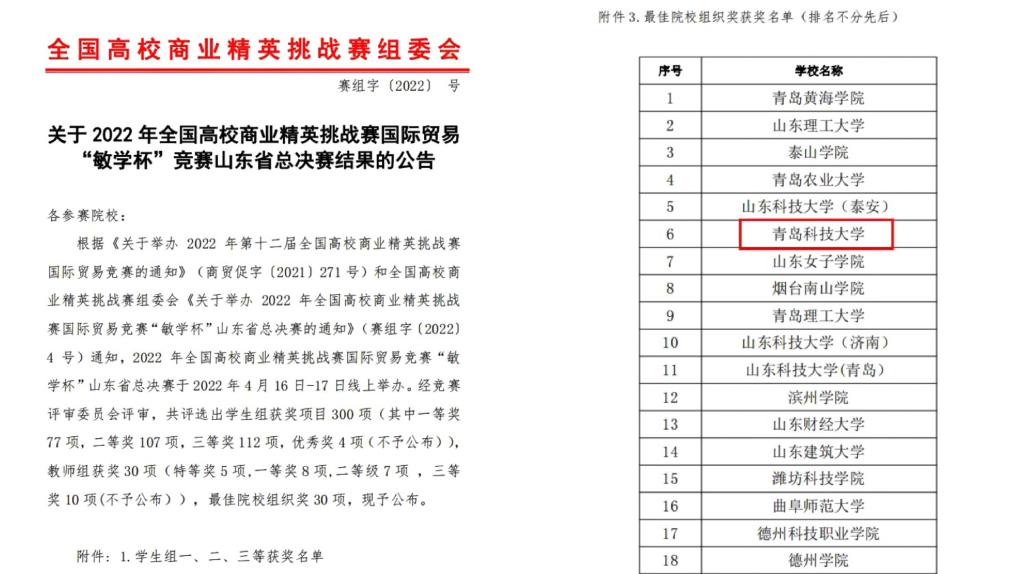 近日,2022年全国高校商业精英挑战赛国际贸易竞赛山东省总决赛竞赛结果公布。经管学院代表队荣获省级一等奖4项、省级二等奖1项、省级三等奖5项,学校获评“最佳院校组织奖”。