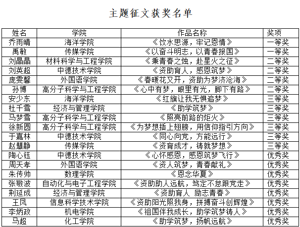 其中,物流201班学生杜千雪的文章《助学筑梦》获大赛三等奖,国贸201班学生荆延成的文章《资助育人·励志青春》获大赛优秀奖。