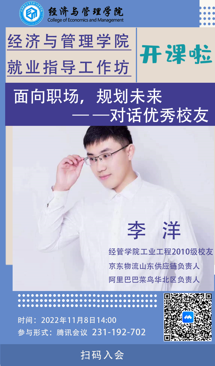 齐心协力抗疫情,就业指导不断线。面对疫情带来的复杂就业形势,经管学院推出“促就业”组合拳,开展就业指导工作坊,助推2023届毕业生高质量就业。11月8日,就业指导工作坊第一讲邀请工业工程专业2010级优秀校友、京东物流山东供应链负责人、阿里巴巴菜鸟华北区负责人、山东速达云仓仓储服务有限公司和山东合聚网络技术有限公司的联合负责人李洋开展《面向职场,规划未来——对话优秀校友》经验分享交流会。经管学院工业工程系主任于龙振,2023届毕业生辅导员孙一君,2023届全体毕业生和部分低年级学生参加会议。