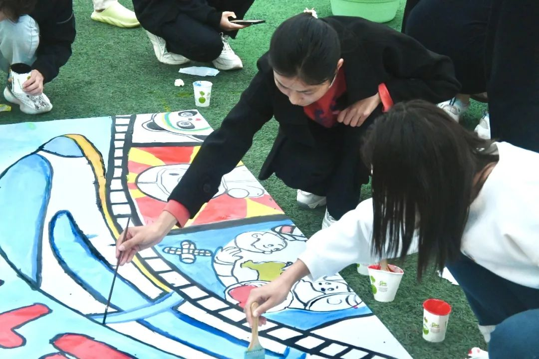 此次绘制过程中,同学们互帮互助,配合默契,让心之旋律在纸上波起涟漪,让画笔随灵魂的律动共同起舞,从冬奥可爱的“冰墩墩”到疫情期间激励人心的“大白”,从“天宫三号”的发射到5G的飞速发展为生活创造更多便利,再到从无到有一步步领先世界的高铁,一幕幕的画面在画布上缓缓展开,大家共同完成这幅记录着新时代改革取得成就的壮阔山河画。