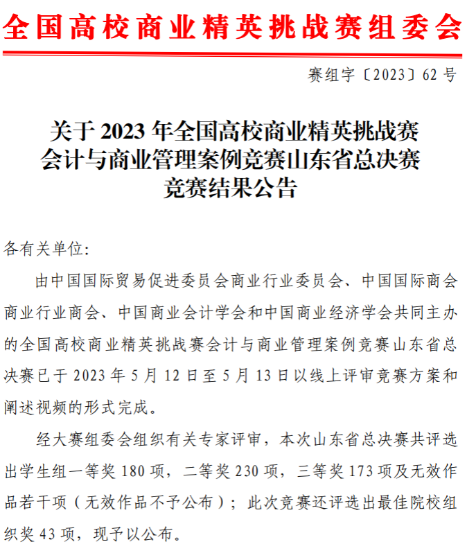近日,由中国国际贸易促进委员会商业行业委员会、中国国际商会商业行业商会、中国商业会计学会和中国商业经济学会共同主办的全国高校商业精英挑战赛会计与商业管理案例竞赛山东省总决赛以线上评审竞赛方案和阐述视频的形式完成。经管学院参赛队伍全部获奖,荣获省级一等奖12项、二等奖10项、三等奖14项,学校获评最佳院校组织奖。