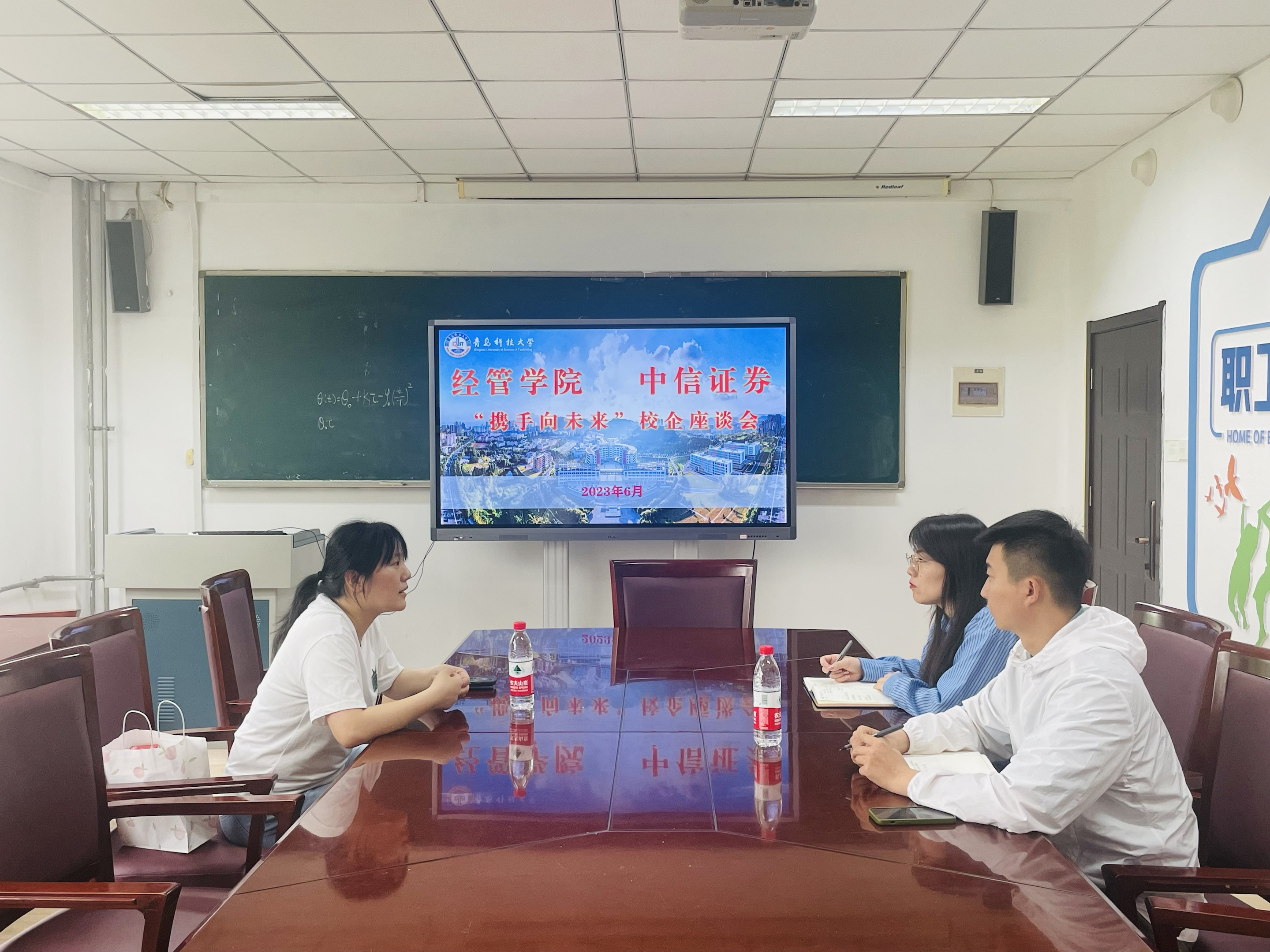 为扎实推进“访企拓岗促就业”专项行动,深挖就业资源,拓宽就业渠道,6月7日上午,经管学院与中信证券于经管楼415会议室举办“携手向未来”校企座谈会,中信证券统一客户联络中心许娜经理来校交流,探讨人才招聘、实习合作等相关事宜。学院2024届毕业生辅导员付凯、袁绍正参加座谈会。