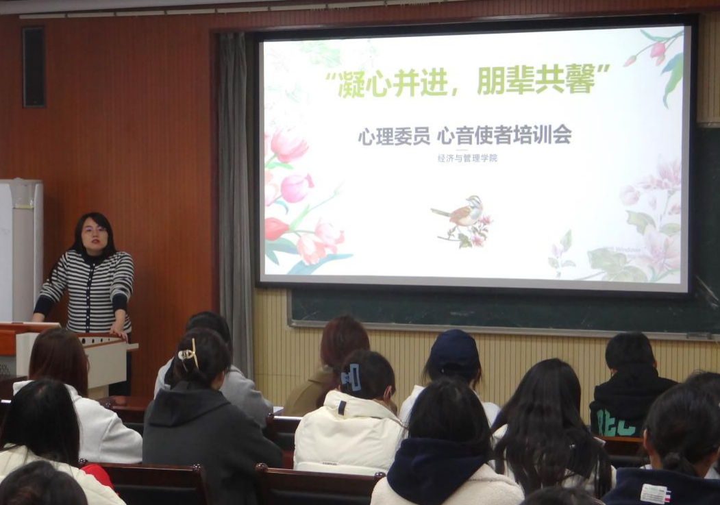为进一步落实立德树人根本任务,坚持健康第一教育理念,加强心理健康教育朋辈队伍建设,切实为同学们的心理健康保驾护航,11月21日下午,经管学院于经管楼419会议室开展“凝心并进,朋辈共馨”新生心理委员培训会,培训会由学院心理工作站站长付凯主讲,2023级本硕心理委员以及院权益部成员参加此次学习。