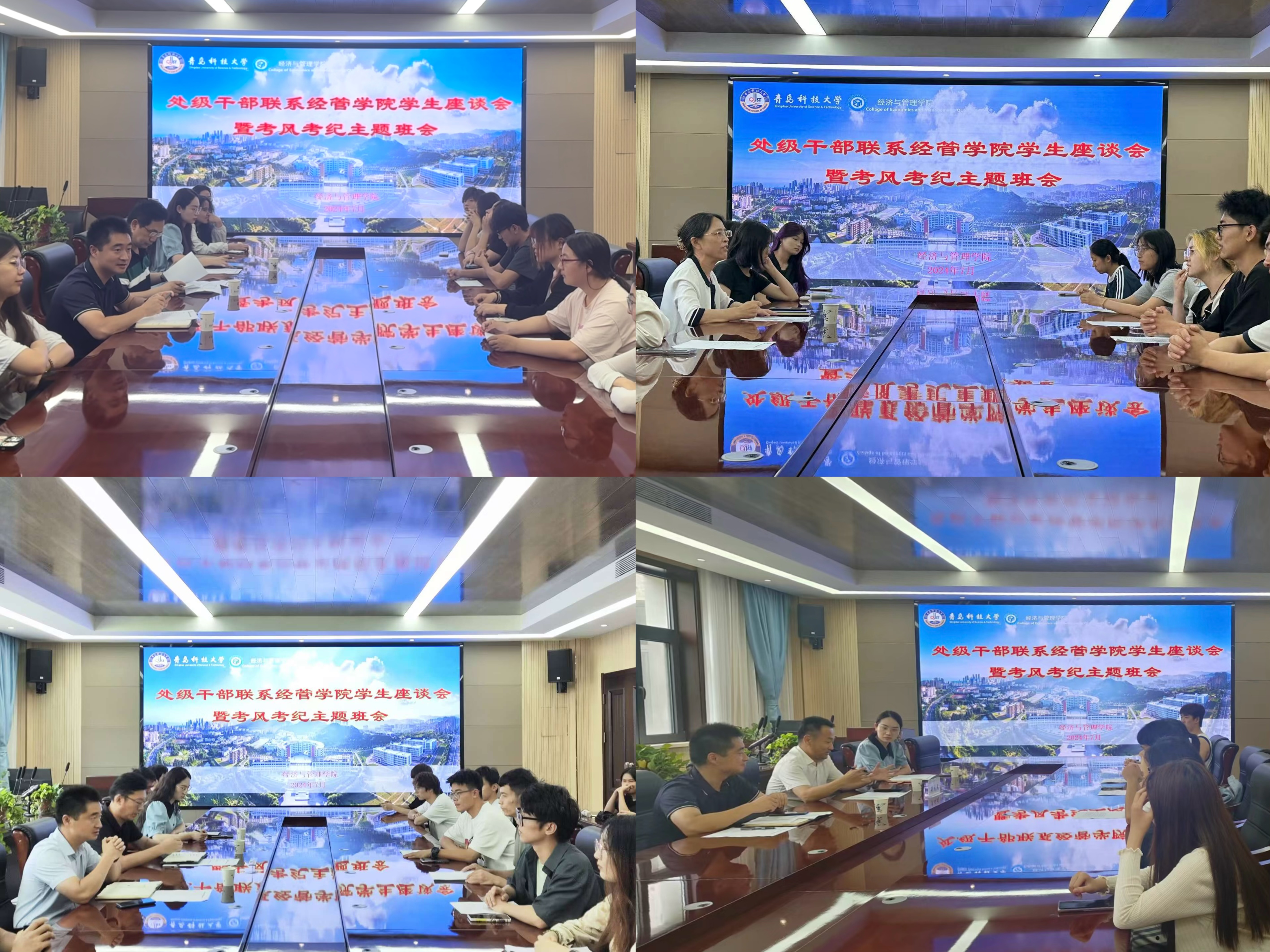 为积极响应学校机关处级干部联系学生班级通知精神,落实立德树人根本任务,服务学生成长成才,7月3日至4日,经管学院2023级联系处级干部分别与联系班级举行座谈会暨考风考纪教育主题班会。党委(校长)办公室、党委巡察工作办公室、学报编辑部等部门处级干部出席座谈会,与同学们亲切交流。学院党委副书记牛宝卫及2023级辅导员占晓祎参加座谈会,座谈会由牛宝卫主持。