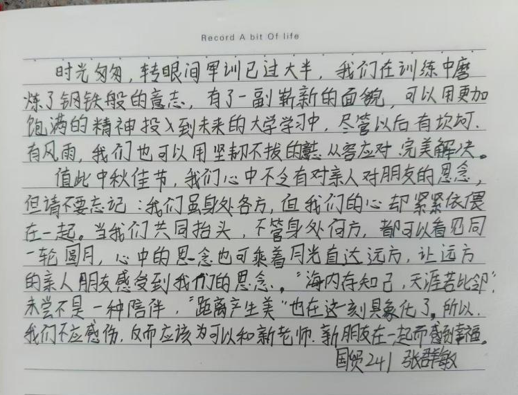 清秋有信情抵万金,丹青绘月共赏婵娟。学院举行“传文明 话中秋 汇文艺 颂党情”新生中秋团建活动,在操场设立中秋邮电箱,同学们以打电话、发短信或书信的方式,给远在他乡的亲朋好友传递思念、分享生活、送上祝福。组织学生拍摄与中秋有关照片,使用涂鸦笔、贴纸等功能进行绘制,形成自己的中秋打卡。此外,同学们在教室举行中秋爱国主义观影活动并书写感悟。
