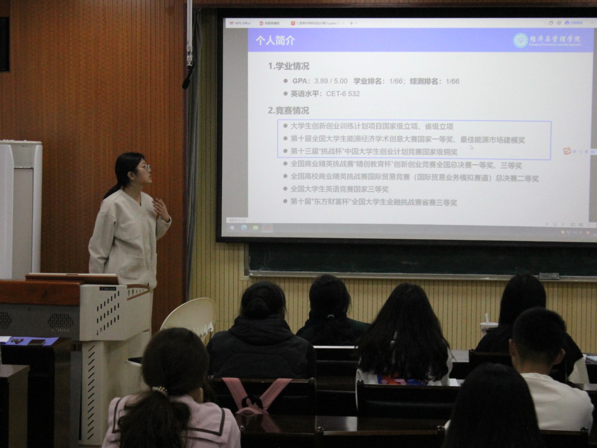 工业专业的李子超以自己对工业工程的深刻理解,为同学们打开了专业知识的新视野,强调特别是要提前了解保研政策、明确保研目标院校及专业、制定科学合理的复习计划,鼓励同学们勇敢追梦。物流专业的于婉婷详细地为同学们解读了本专业的发展方向,解答了对于有目标保研的同学需要做的准备工作。国贸专业的顾茗月分享了保研前期规划、预推免面试心得以及竞赛宝贵经验,为同学们说明了申请的注意事项,讲明夏令营和预推免的区别,解决了学生们的相关困惑。