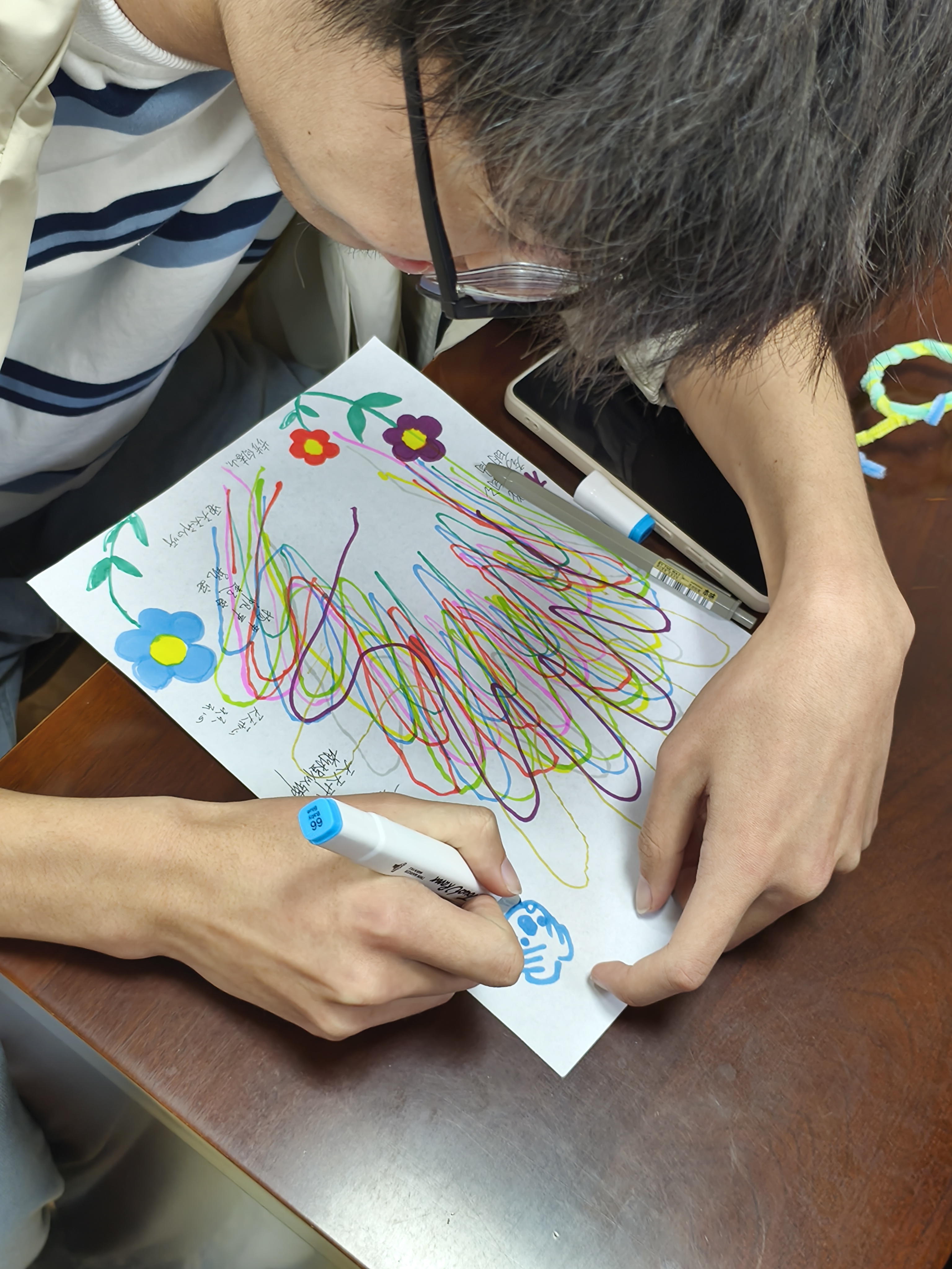 以开展“‘击’扬青春,别具‘绘’眼击掌绘画活动”为契机,将育心育德融入其中,搭建交流平台。活动时,同学们轮流在A4纸上画手掌轮廓、写励志话语并传递,过程中大家纷纷展露笑颜。该环节提升学生表达善意能力,并拉近了同学们之间的距离,推动校园友善氛围建设,助力将对生命的关爱与尊重化为日常的实际行动。