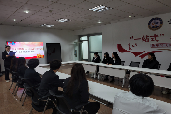 在五四青年节来临之际,经管学院团委举办 “传承五四薪火,共话青年担当” 主题座谈会,为新时代青年学子架起跨越历史的精神桥梁。座谈会上,青年学子代表声情并茂讲述了周恩来、刘和珍等革命先锋青年时期的奋斗故事。他们讲述的,是爱国精神在动荡年代的不屈呐喊,是进步思想于黑暗中绽放的耀眼光芒,是民主理念在探索路上的执着坚守,是科学精神向未知领域的无畏进发。这些故事,点燃了青年学子追寻五四精神的热情之火,唤醒了青年学子勇担时代使命的责任之心,指明了青年学子坚定奋进的前行方向。
