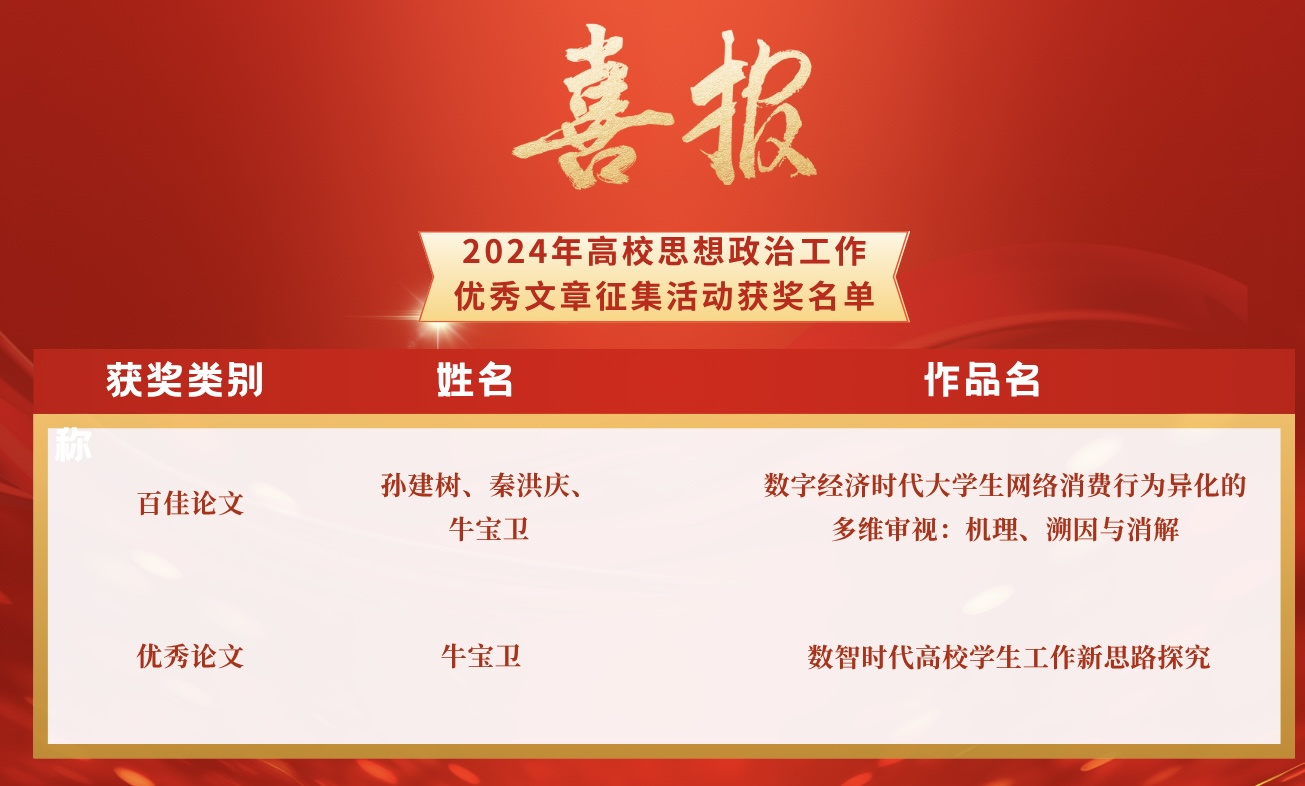 近日,由教育部高校思想政治工作队伍培训研修中心与《高校辅导员》编辑部联合主办的2024年高校思想政治工作优秀文章征集活动评选结果正式揭晓。我院提报的两篇论文从全国1549篇论文中脱颖而出,分别荣获“百佳论文”(第一作者:孙建树)和“优秀论文”(第一作者:牛宝卫)。