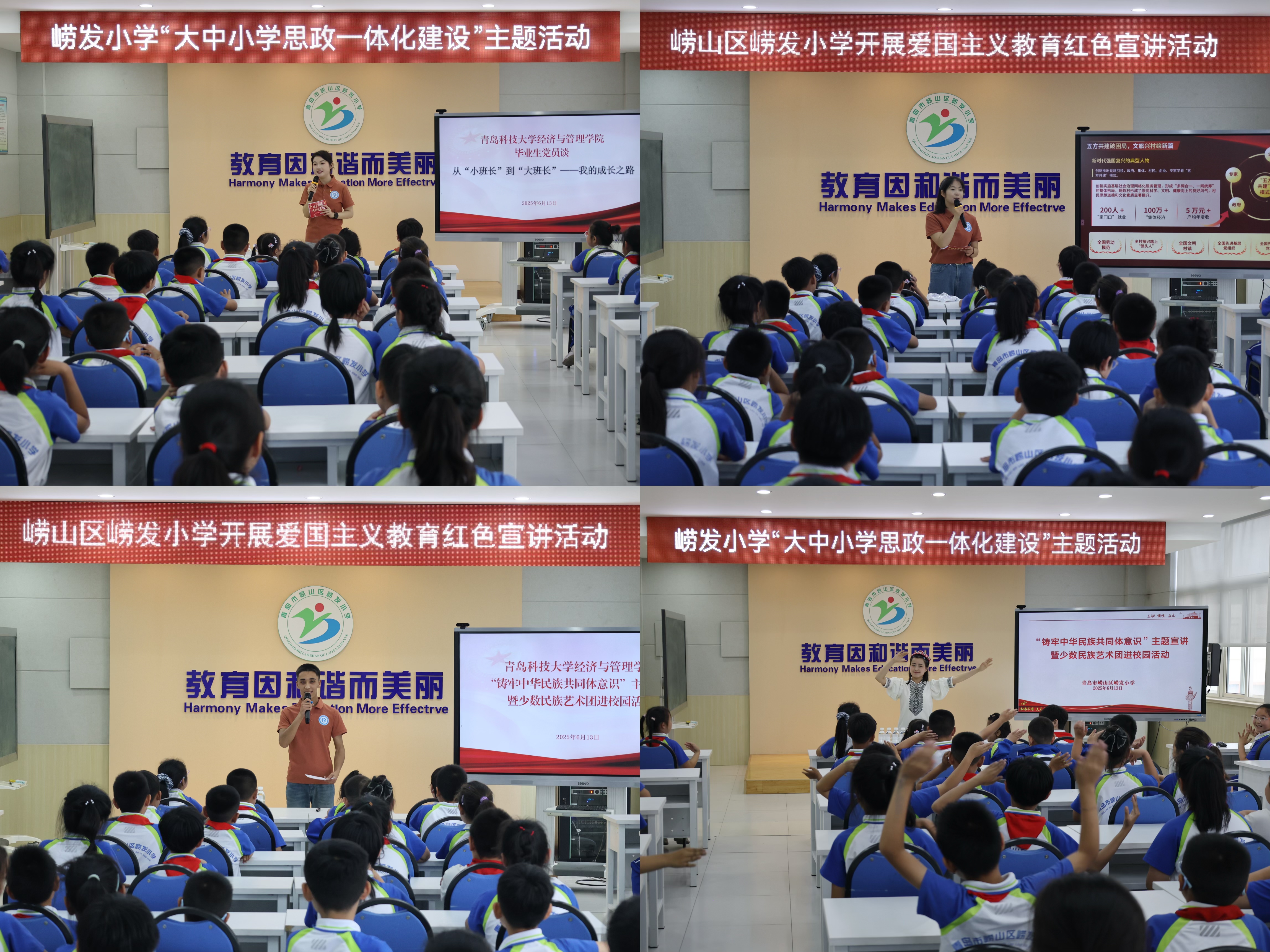 签约仪式后,经管学院学生党员代表与崂发小学学生共同开展“大中小学思政一体化建设”主题活动。毕业生党员代表张一豪向小学生们分享了自己的成长故事,生动诠释了“入队、入团、入党”这一青年追求政治进步的“人生三部曲”,让现场的小学生们深受鼓舞。学院“润心宣讲团”代表吴嘉怡讲述了“从乡村热土到强国征程的奋斗故事”,并向小学生们延伸讲解了“先锋”的含义,号召大家向先锋榜样学习,不怕困难、勇敢前行,努力成长为能够担当民族复兴大任的时代新人。学院少数民族艺术团学生代表依克山·阿布拉提江和米娜瓦尔·艾依热提为小学生们开展铸牢中华民族共同体意识主题教育宣讲,通过故事讲述、舞蹈互动等形式让铸牢中华民族共同体意识在少年儿童心中生根发芽。活动现场气氛热烈,生动展现了党建引领下大中小学思政教育一体化的实践成果。