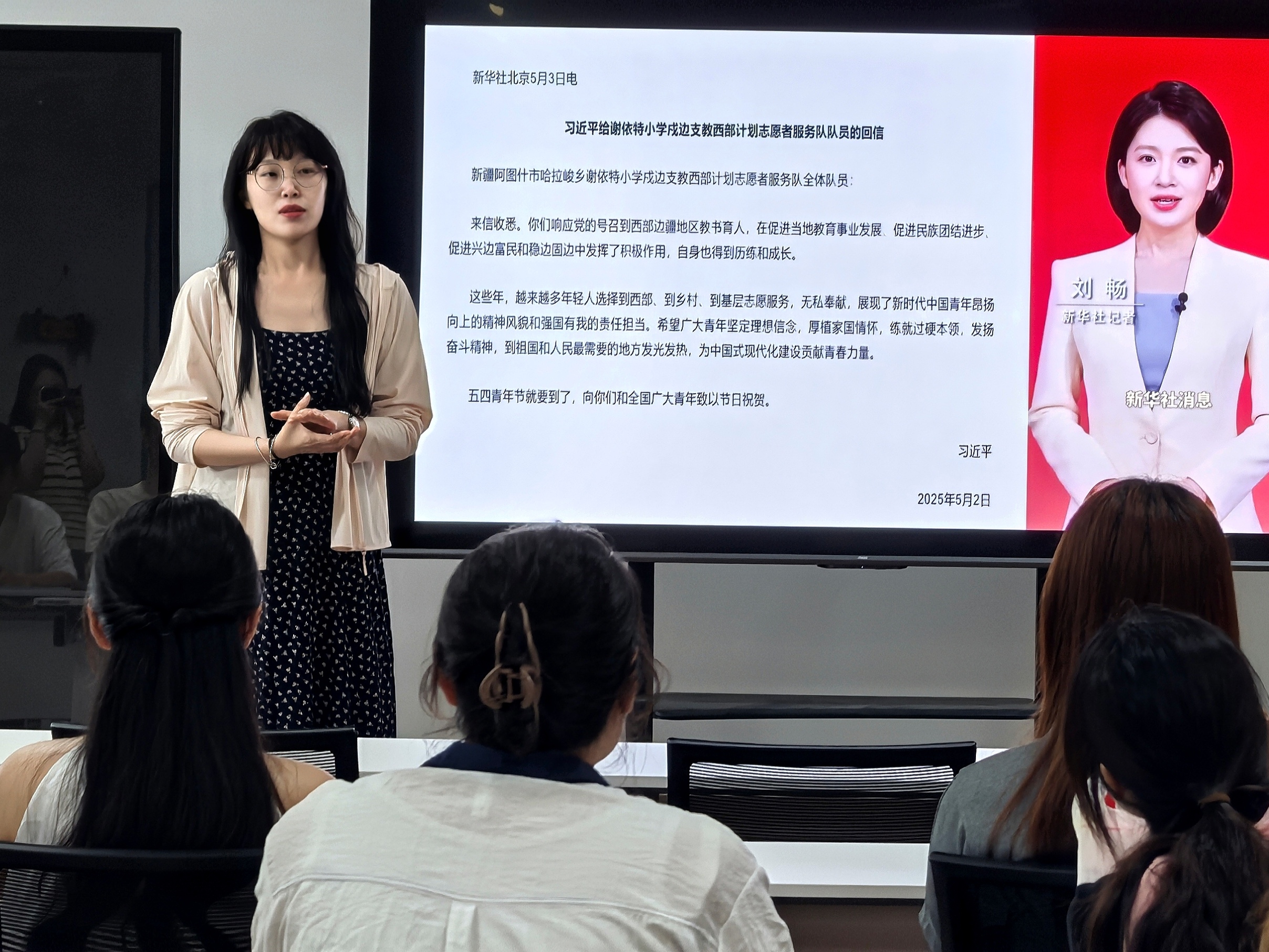 在谢依特回信精神专题学习活动中,经管学院团委组织学生研读回信原文,郝家玮以自身西部支教经历为例,深刻诠释专业知识与家国情怀结合的实践价值,向学生提出三点要求:一是要以“信仰之魂”筑牢思想根基,做立场坚定的“追光者”;二是要以“奋斗之姿”书写青春答卷,做知行合一的“实干家”;三是要以“品德之尺”丈量人生高度,做引领风尚的“先锋队”。学生围绕“如何将回信精神融入学习与生活”展开讨论,踊跃分享心得体会。学生表示,将以回信精神为指引,树立远大理想,提升专业素养,在时代浪潮中贡献经管智慧。