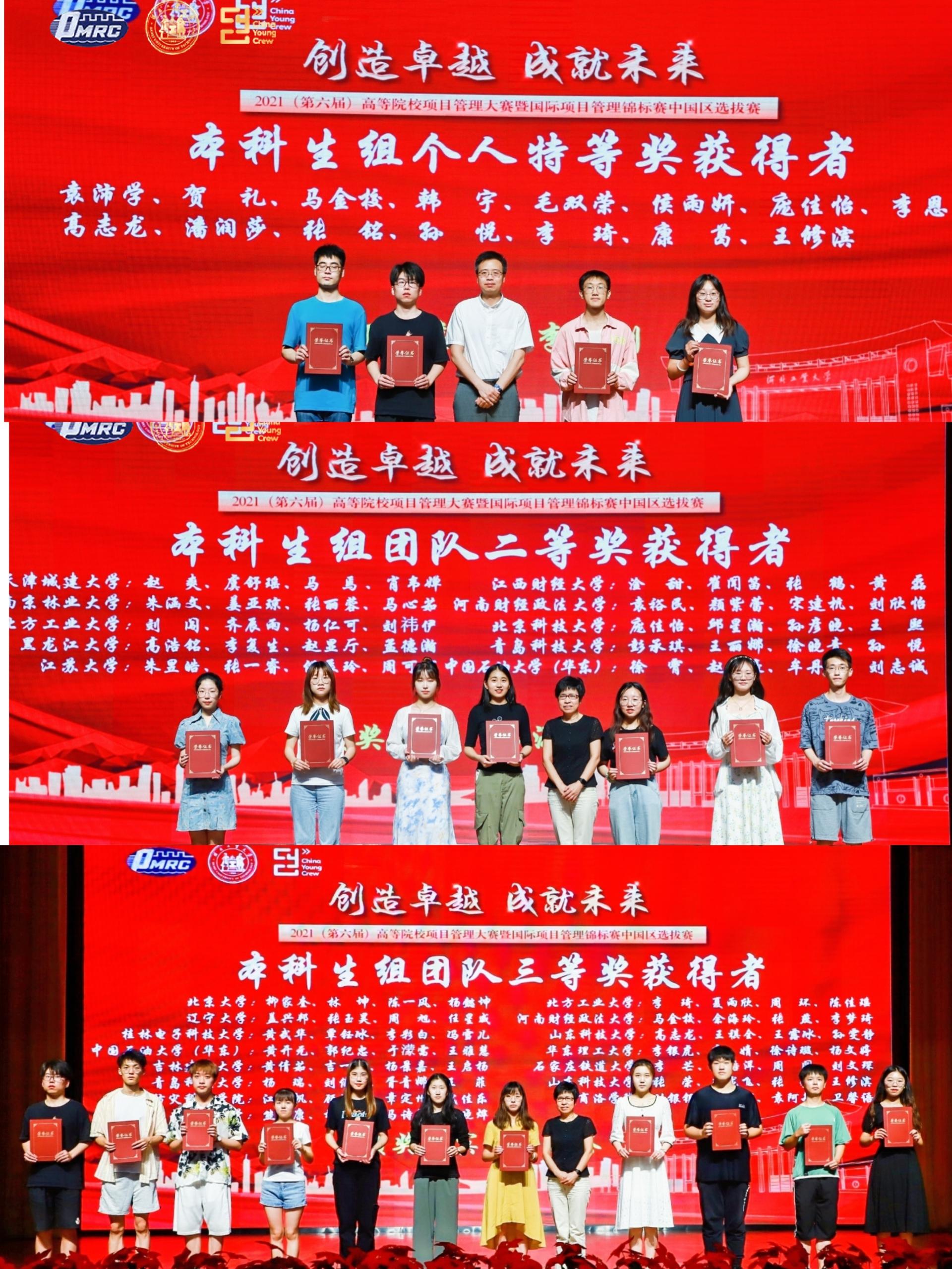 全国高等院校项目管理大赛是面向在校大学生的全国性项目管理学科竞赛,受到各院校的高度认可和重视。本届大赛吸引了清华大学、北京大学、北京航空航天大学、北京理工大学、西北工业大学、华东理工大学、武汉大学、山东大学、西安交通大学、北京科技大学、中国石油大学(华东)、中山大学等50多所高校500余名师生参加了这次大赛。bat365官方官网选派的2支本科生队,由董华教授和黄天赐老师带领8名同学参加比赛。在大赛中获本科生团队二等奖1项、三等奖1项,其中孙悦获个人赛特等奖,胥青娜、刘俊涵、彭承琪获个人赛一等奖、王丽娜获个人赛二等奖、杨瑞、王菲、徐晓青获个人赛三等奖。
