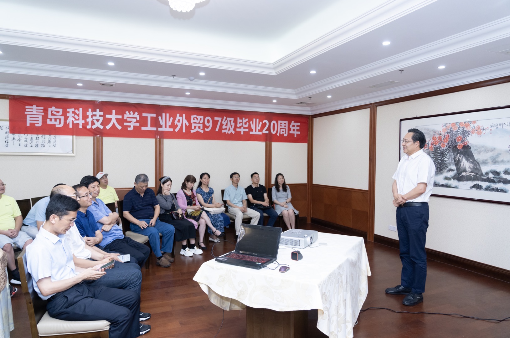 7月16日下午,工业外贸(现国际贸易)97级校友毕业20周年聚会仪式在青岛八大关宾馆举行。学校副校长、校友总会常务副会长韦殿华,经管学院院长李勋来,学院原领导李利、杜裕禄,时任学院分团委老师丛松涛、刘伟、肖强,时任任课老师蔡苏文、岑彩云、张同功、陈岩、任燕应邀参加仪式。