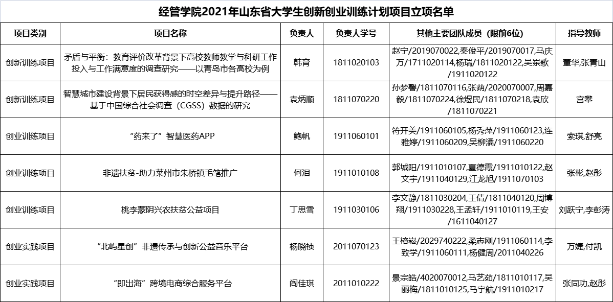 日前,山东省教育厅公布2021年山东省大学生创新创业训练计划项目立项名单,经管学院7个项目获批立项,立项数量较往年有较大幅度的提高。