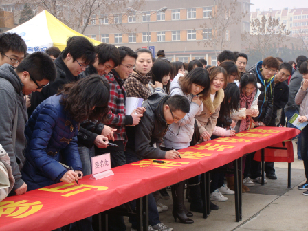 此次启动仪式首先邀请了张华强副主任发表讲话,他介绍了我国的结核病蔓延的现状以及疫情的严重性,同时提出了相应的预防方法。紧接着经管学院党总支副书记张同雷发表了讲话,他高度赞扬这次活动,并鼓励在场的经管学院师生积极参与到此次活动中来。随后刘居庆局长介绍了四方区历年来的结核病预防与防治工作,并动员在场师生积极进行结核病防治知识及政策的宣传。讲话完毕,各位领导便在主题横幅上签字。随后现场观众亦踊跃参加现场的签名活动。最后,启动仪式进入互动环节,志愿者报名、现场知识竞答、现场咨询,同学们纷纷积极参加,场面十分热烈。