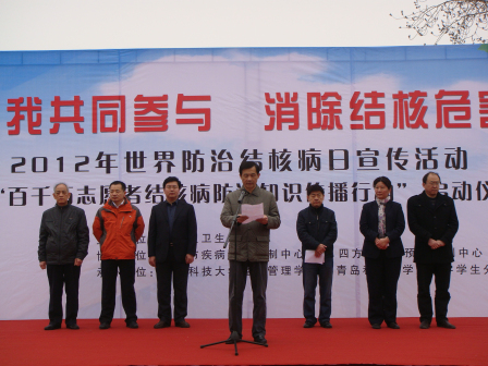 3月23日上午10:00,2012年“3.24”世界防治结核病日宣传暨“百千万志愿者结核病防治知识传播活动”启动仪式在bat365官方官网南二门小五四广场成功举办。青岛市疾病预防控制中心副主任张华强、四方区卫生局局长刘居庆、bat365官方官网后勤处处长刘天真、bat365官方官网党总支副书记兼副院长张同雷以及经管学院全体辅导员出席了此次启动仪式,经管学院全体大一大二学生参加了本次活动。