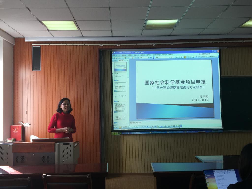 然后由周南南老师分享其立项课题《中国分享经济核算理论与方法研究》的撰写经历和“打破常规”经验。周老师的分享分为三部分,第一部分为:选题。她指出:“好的选题是成功的一半”。选题要结合个人研究方向和积累成果、结合经济社会热点、结合国家社科基金重大招标项目申报指南等。第二部分为:国家社会科学基金项目课题论证。对于该部分的每一模块周老师都有自己独特的见解,比如:在选题依据上她强调最重要的是破题,即让专家和非专家都能理解课题的意义。在研究内容上她指出原则上是5条,但由于在该模块最重要的是内容详实,所以她打破常规写了7条。在思路方法上指出要绘制技术路线图,使得整体结构清晰明了。在参考文献上,外文文献的占比要大一些同时罗列的文献要有代表性等。