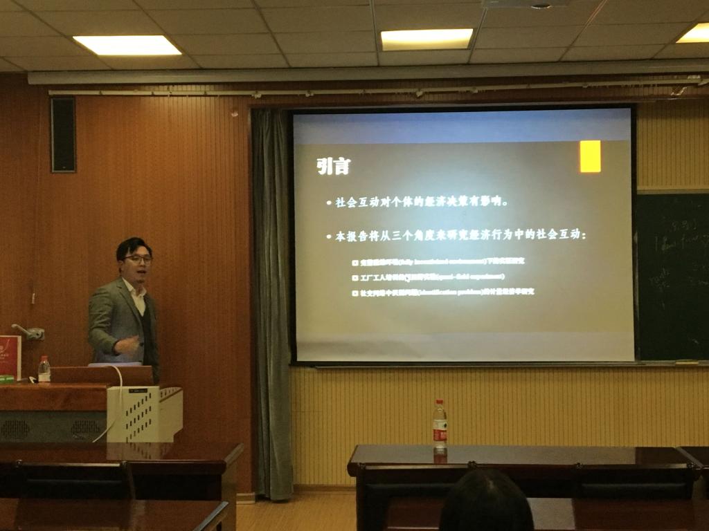 随后,他通过两个拟田野实验展开了此次报告的主题内容。第一个实验题目为《社会互动与经济决策—在纺织工厂中的田野实验》。此实验主要研究的是社会互动对个体的经历决策是否有影响。报告依次从”完整激励环境下的实证研究、工厂工人培训的拟田野实验、社交网络中识别问题的计量经济学研究”三个角度来研究了经济行为中的社会互动。他通过收集假设前提条件下工人们的每天收入与个人信息,然后建立数学模型,最终解释了同群效应的含义,并得出个体属性不同,同群效应也会有所不同的结论。接着,他做的第二个实验题为《师傅和学徒间的社会距离与技术分享的实验报告》,解释了社会距离的含义,并且强调科学家们正在通过不同的方法来研究社会距离,力求把社会距离这个抽象的概念转化为更直观的数学符号。该课题研究的是中国东部的一个大型纺织厂中在显著金钱激励缺失的情况下,社会距离对技术分享过程的影响。他强调,此次实验对现实中管理人员有很重要的启示即:在培训中,缩短员工之间的社会距离是比使用金钱激励更经济的提高培训的方法。
