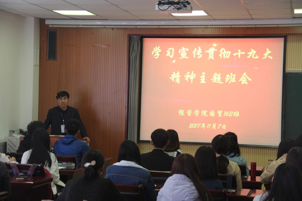 11月7日,经管学院党总支书记聂法良走进联系班级国贸162班,参加“学习宣传贯彻十九大精神”主题班会。与同学们共话当代大学生如何以实际行动学习宣传贯彻十九大精神,畅谈新时代大学生的理想目标。