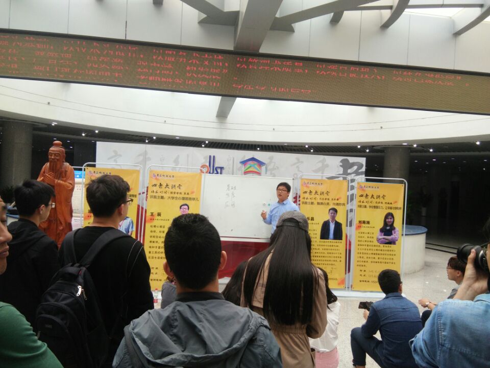 王辰主讲题目为“大学生心理那些事儿”,现场用一块黑板,一支粉笔,户外授课,回归传统。他在简单介绍心理学学科及心理基本常识后,就学生十分关心的人际关系问题进行了讲解。同时,以埃利斯的情绪ABC理论为基础,用幽默诙谐的语言介绍了在遇到人际关系问题时应该怎样去合理面对和解决。