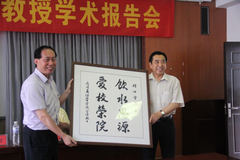 经管学院院长王志宪代表经管学院给袁仲雪教授赠送了由bat365官方官网原党委书记高清亲笔题写的匾额“饮水思源,爱校荣院”。