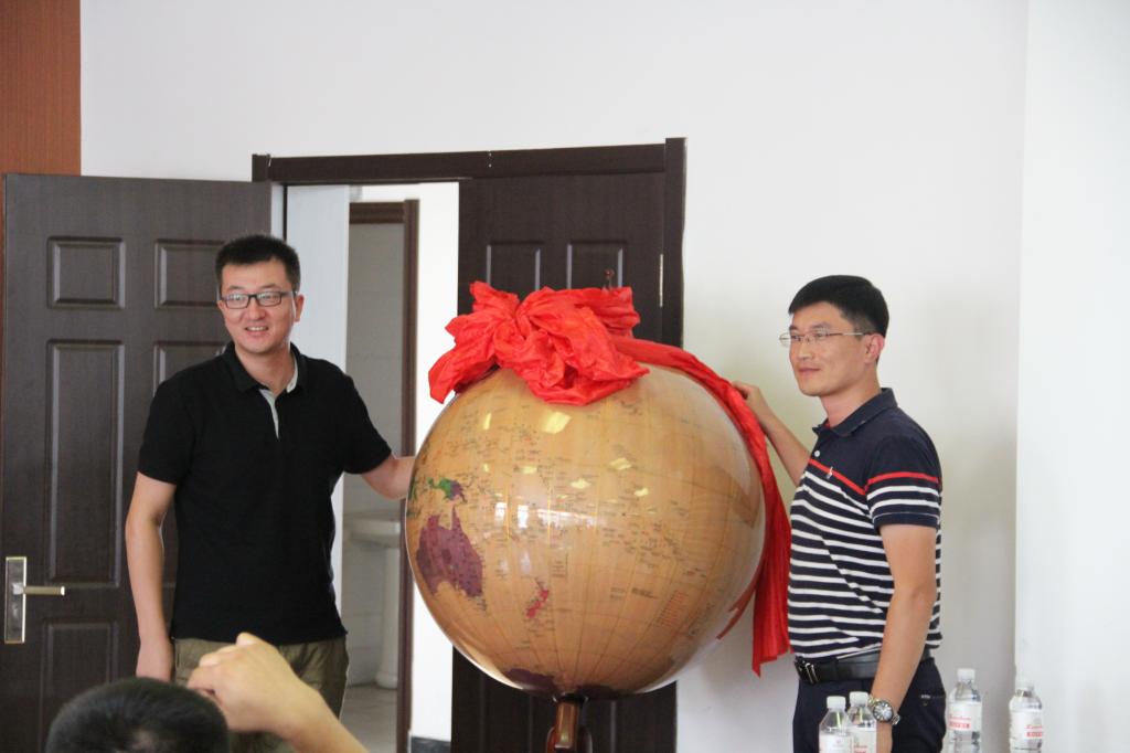 2011级校友捐赠地球仪,李德成教授为他颁发收藏证书,李德成指出感谢校友们的慷慨助学,学院将严格按照捐助者的意向和学校教育发展基金会的规定,将基金全部用于资助贫困学生,奖励品学兼优的学生,做到账目清晰,绝不挪用,请校友们放心。