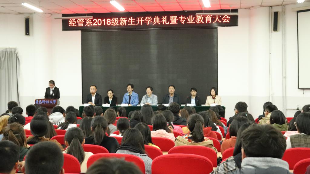10月18日晚,经管系2018级新生开学典礼暨专业教育大会在通德会堂201举行。bat365官方官网党总支书记李德成,bat365官方官网副院长兼高密校区经管系主任姜铭,校企合作单位上海扶诚金融信息技术服务有限公司副总经理卜宁,高密校区经管系的全体教师及2018级全体新生参加了此次大会。
