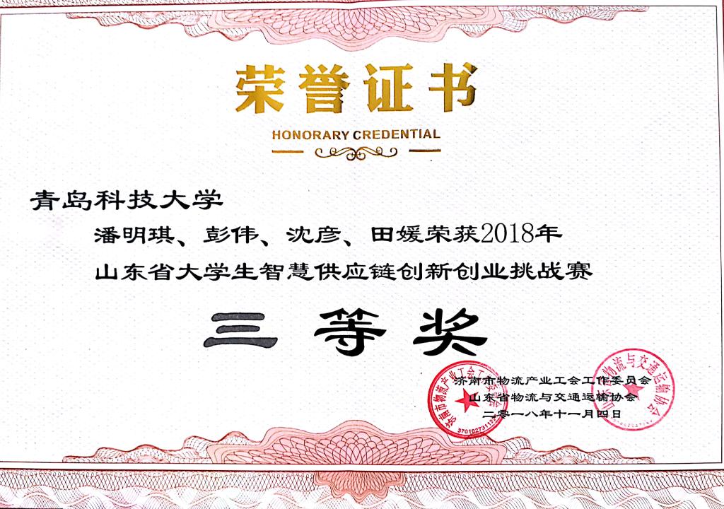 近日,2018年首届山东省大学生智慧供应链创新创业挑战赛在山东财经大学举办,经管学院物流管理专业16级学生组成的两支参赛队伍分别荣获三等奖,展现了青科大学子的风采。