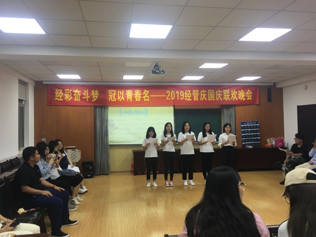 为庆祝中华人民共和国成立70周年,展现当代研究生为梦想实现而奋斗、为青春不悔而努力的爱国精神,9月28日,由经管学院研究生会主办的“经彩奋斗梦 冠以青春名”2019经管研究生庆国庆联欢晚会于经管楼419室举行。经管学院各年级研究生积极参与此次活动。