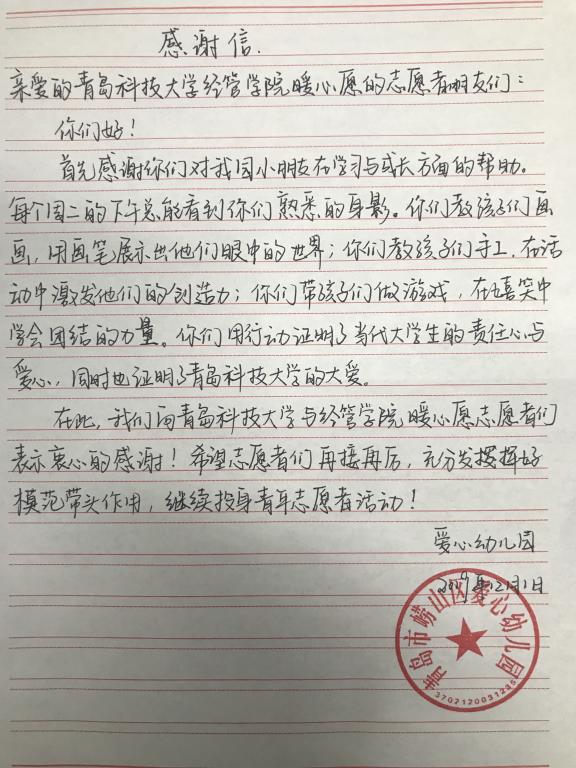 近日,青岛市崂山区爱心幼儿园给我院寄来了感谢信,对经管学院暖心愿志愿服务团队的志愿者们长期以来为爱心幼儿园送去的关爱和帮助给予了高度评价和衷心感谢。