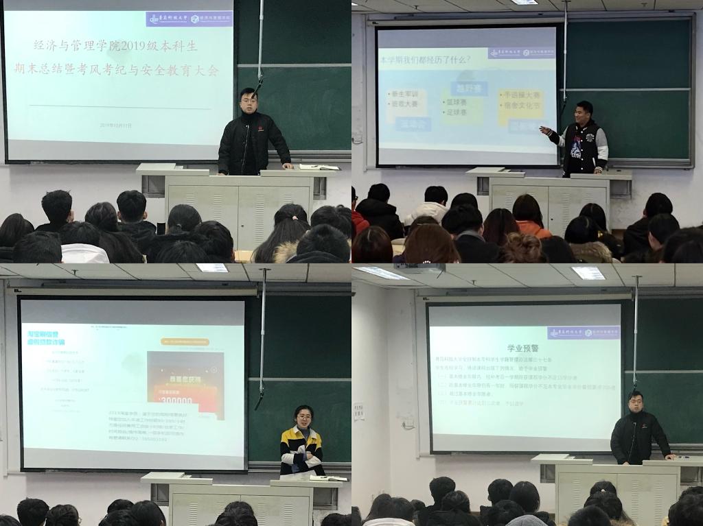 为进一步落实学校、学院关于防电信诈骗与寒假安全教育的工作要求,加强学院学风建设与考风考纪教育,12月17日、18日,经管学院于明德楼412、424分专业召开2019级本科生期末总结暨考风考纪与安全教育大会。本次大会由19级辅导员孙一君老师、初桂民老师、于潇华老师主持,19级全体学生参加。