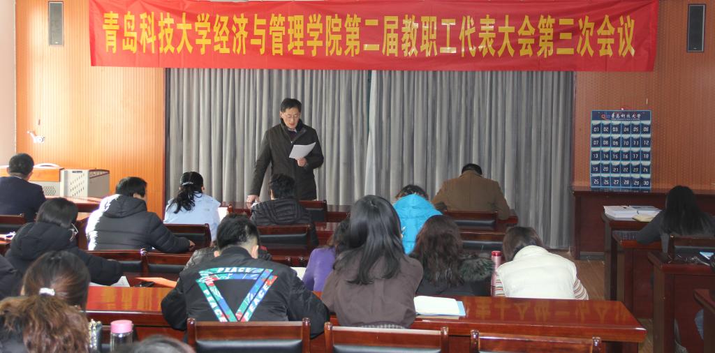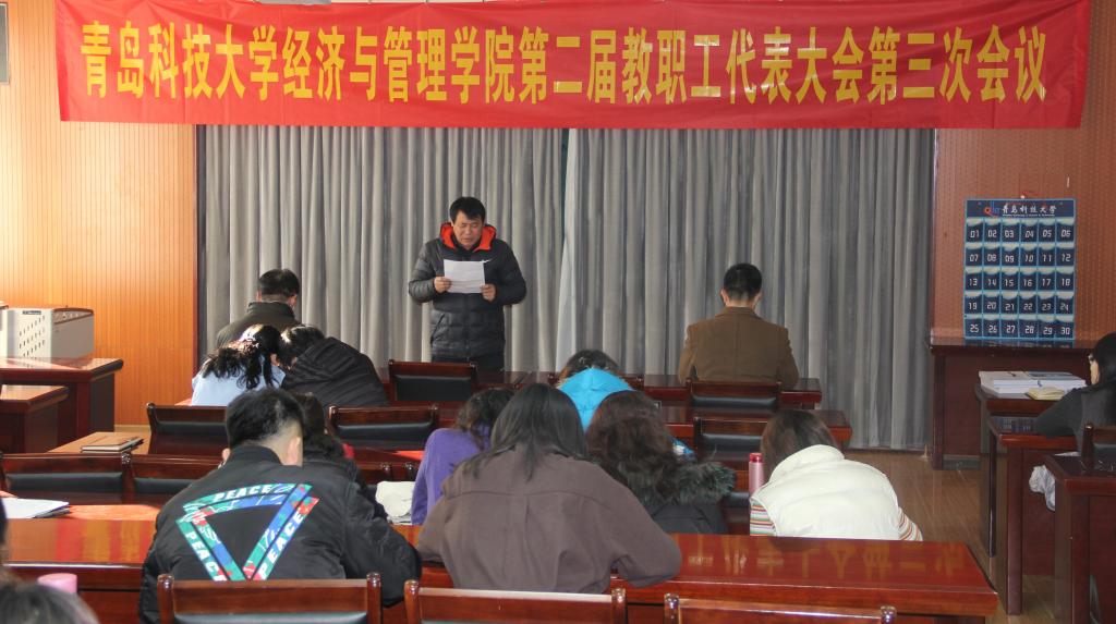 12月31日下午,经管学院于419会议室组织召开第二届教职工代表大会第三次会议,经管学院党总支书记李德成、院长王志宪、副院长董华、副院长杨友才、党总支副书记兼副院长刘跃宁及全体教职工参会。