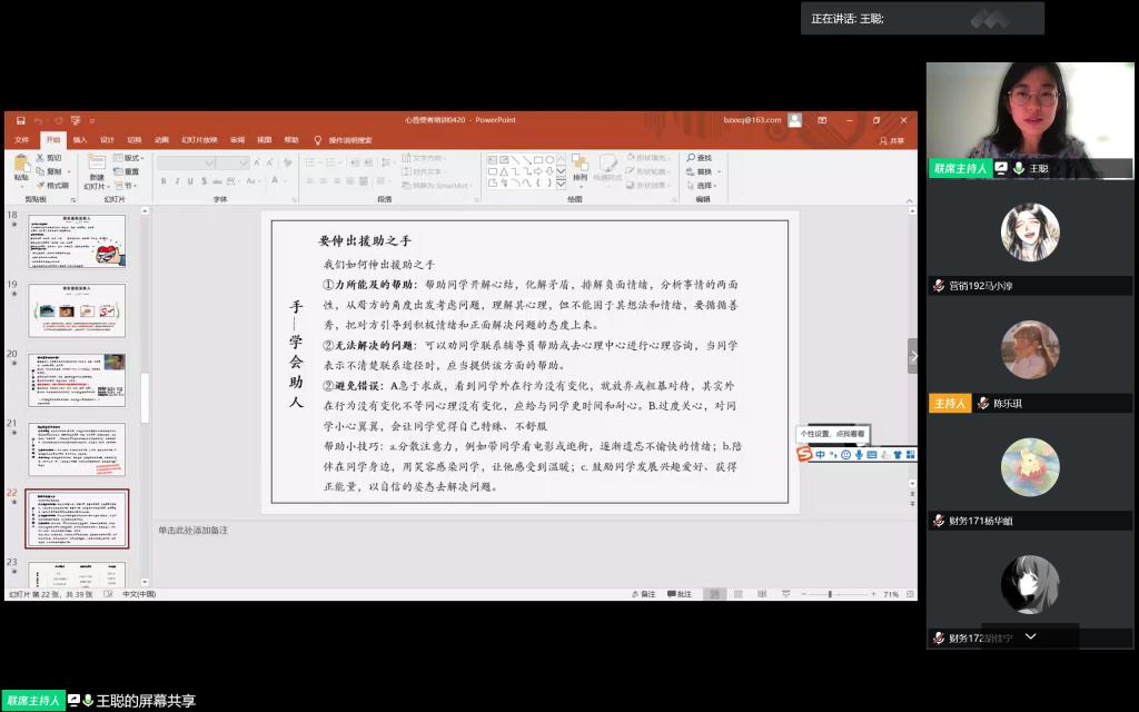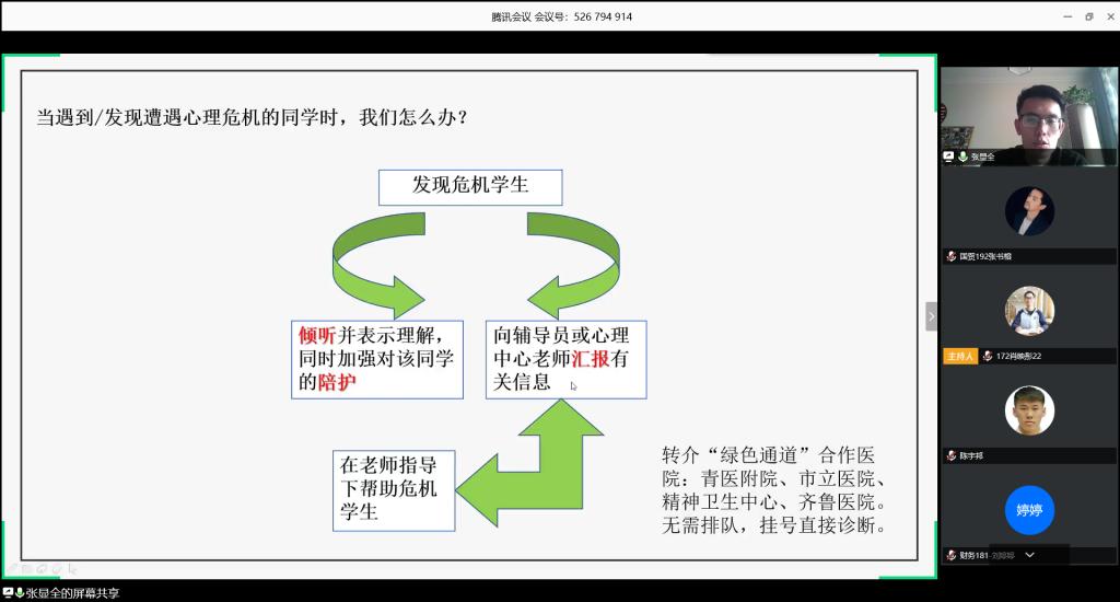 疫情期间,为进一步完善学校、学院、班级、宿舍“四级”心理危机预防联动机制,提高朋辈助人、自助能力,提升学生获得感、幸福感、安全感,充分发挥“心音使者”在心理健康工作中的重要作用,4月21日下午3点,经管学院借助腾讯会议平台举办“心音使者”线上培训会,学院心理工作站王聪、张显全担任主讲老师,2016级、2017级、2018级共计285名“心音使者”参加了培训。