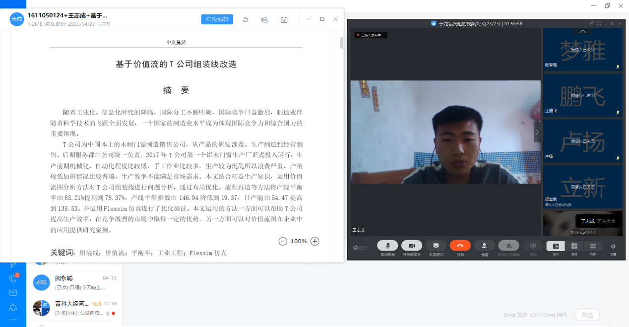 根据经管学院2020届本科毕业生答辩进度计划,学院本科生毕业论文中期检查报告会于4月28日下午顺利进行。受新冠疫情影响,学校推迟开学,学院各专业提前组织计划,克服重重困难,对550余名2020届毕业生开展了线上毕业论文中期检查。学院7个本科专业共分成23个检查小组,各专业本科生导师以及全体毕业生通过腾讯会议等网络平台在线参加了毕业论文中期检查报告会。