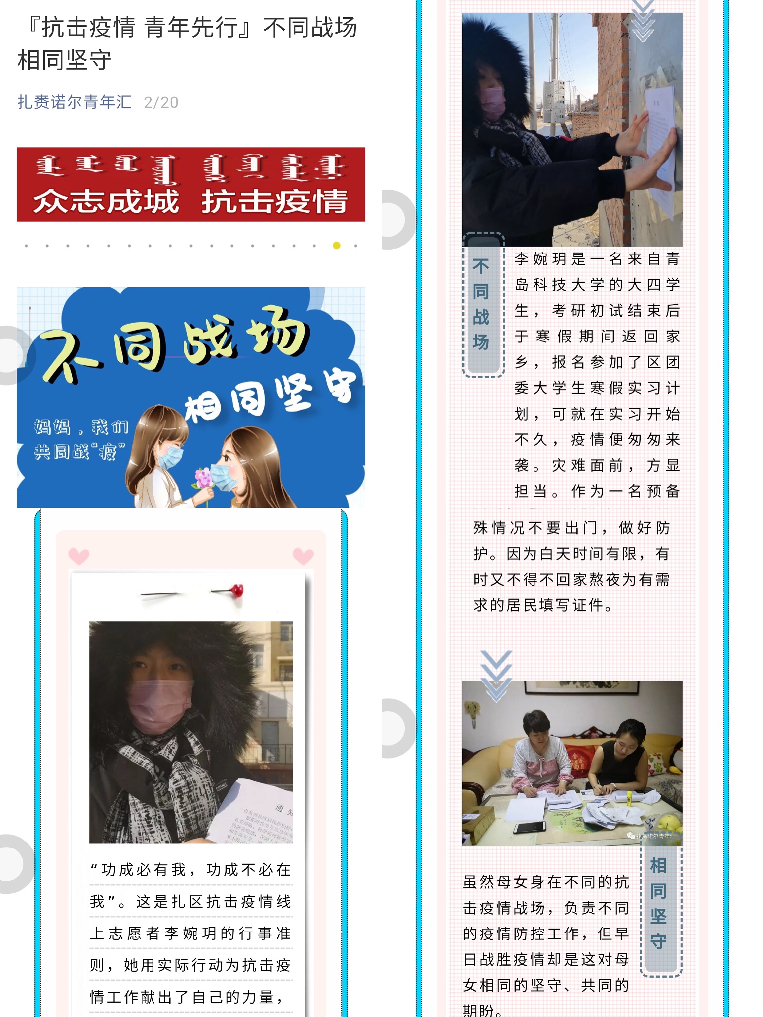 李婉玥是经管学院城市管理专业161班的一名中共预备党员,自放假后一直在呼伦贝尔市扎赉诺尔区政府团委实习。为积极参与到疫情防控工作中来,她义无反顾报名成为一名抗疫线上外宣志愿者,负责抗疫楷模报道和信息采编工作。截至目前,李婉玥向扎赉诺尔区团委供稿多篇,其中《与您并肩 我自心安》、《301国道上的“暖心大白”》等四篇文章在扎赉诺尔区团委公众号上进行发表,且得到中国新闻网、呼伦贝尔团委、呼伦贝尔新闻等各大媒体平台的广泛转载。同时,她与同为志愿者的妈妈经常一起加班加点,熬夜赶制居民出入证,保证居民日常生活平稳有序进行。李婉玥和妈妈的志愿者事迹被当地官微进行专题报道,对此,李婉玥表示,“哪里有疫情,哪里有需要,哪里就是主战场。关键时刻冲得上去,危难关头豁得出去,才能不负入党誓词!”