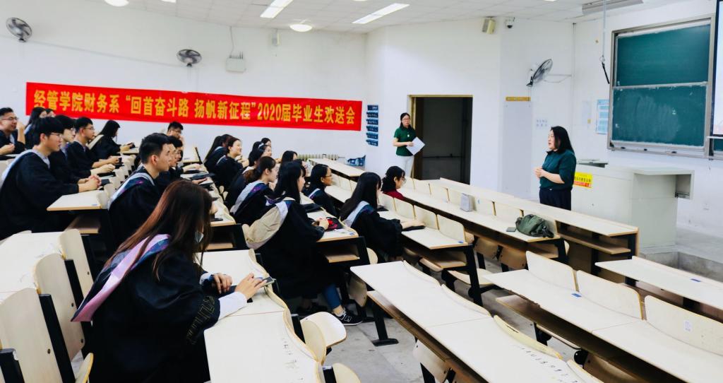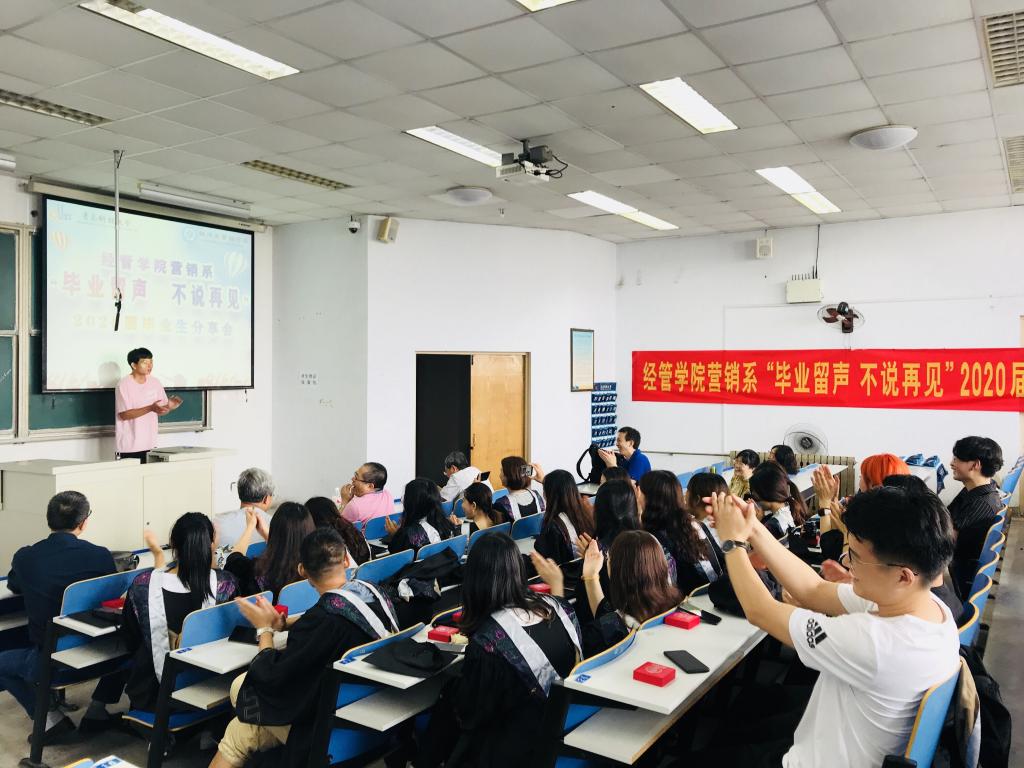 惜别·远航--恋母校,一枝一叶总关情。6月14日,学院在弘毅楼7个教室举行七专业各具特色的毕业生主题活动,国贸的座谈会、管理的最后一堂课、财务的欢送会、工业的惜别会、城管的交流会、营销的分享会、物流的畅谈会,各系主任、专业老师、辅导员老师为即将离开母校的学子送上毕业寄语。在这个特殊的毕业季,学院为同学们准备了暖心小礼物:一枚校徽和一枚院徽,希望同学们带着学校的祝福、带着在经管学习生活的美好回忆,开启人生新征程。会后,全体同学共同收看了校毕业典礼暨学位授予仪式直播。