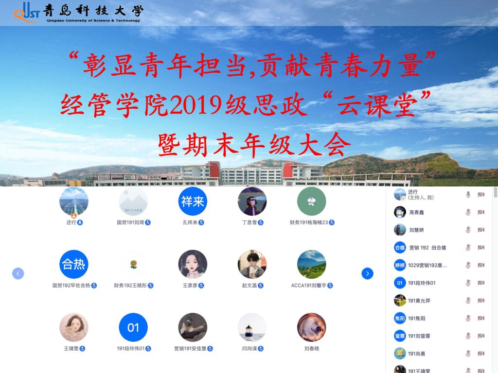 为引导学生在疫情下主动学习、主动思考、主动实践,汲取成长的青春“正能量”,以及统筹抓好常态化疫情防控和期末诚信考试教育工作,7月6日至7日,经管学院2019级分专业召开“彰显青年担当,贡献青春力量”思政“云”课堂暨期末年级大会。会议通过腾讯会议平台召开,由19级辅导员孙一君、初桂民、于潇华主持,19级全体学生参加。