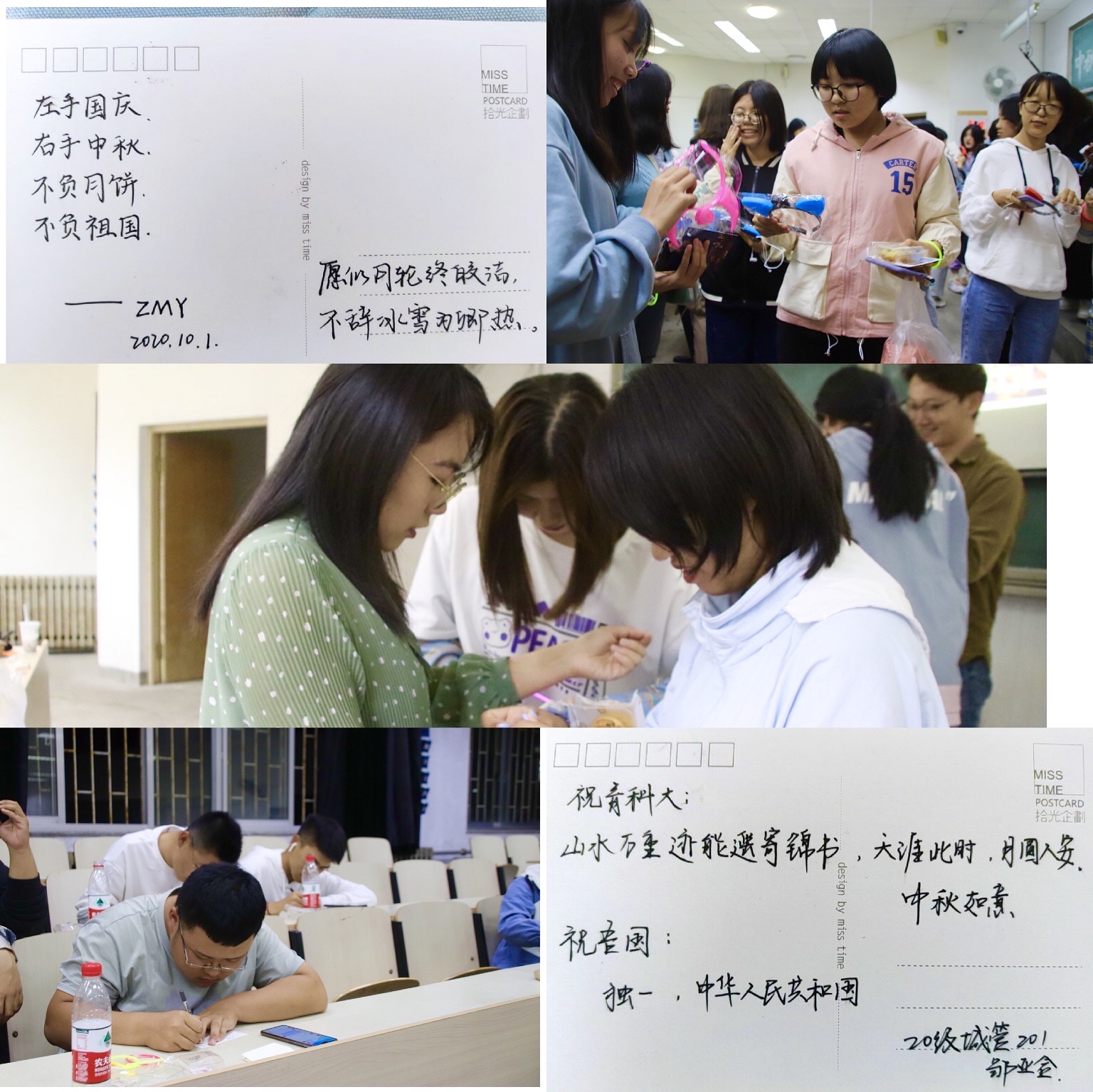 学院以“随风寄相思”为主题,开展明信片互递活动。“字字传递真情,句句书写真心。“最温馨的阶段莫过于手写祝福。”祖国快乐,月亮快乐,你也快乐。“”十月的好运拍了拍你。“”平安喜乐,万事胜意。“身在异乡,收到来自同学的花式祝福,让大家感受到了经管大家庭的温暖。月圆中秋夜,共话温暖情,正如工商管理201班张嘉欣同学所说:”这是我过的第一个中秋国庆相遇的双节,恰逢我与青科的相聚,不胜欢喜。今年的中秋国庆,没有往日与亲人的欢聚,却拥有一群可爱的人——我在青科的家人们。”独特的感悟和真实的情感洋溢在每个学子的心头。