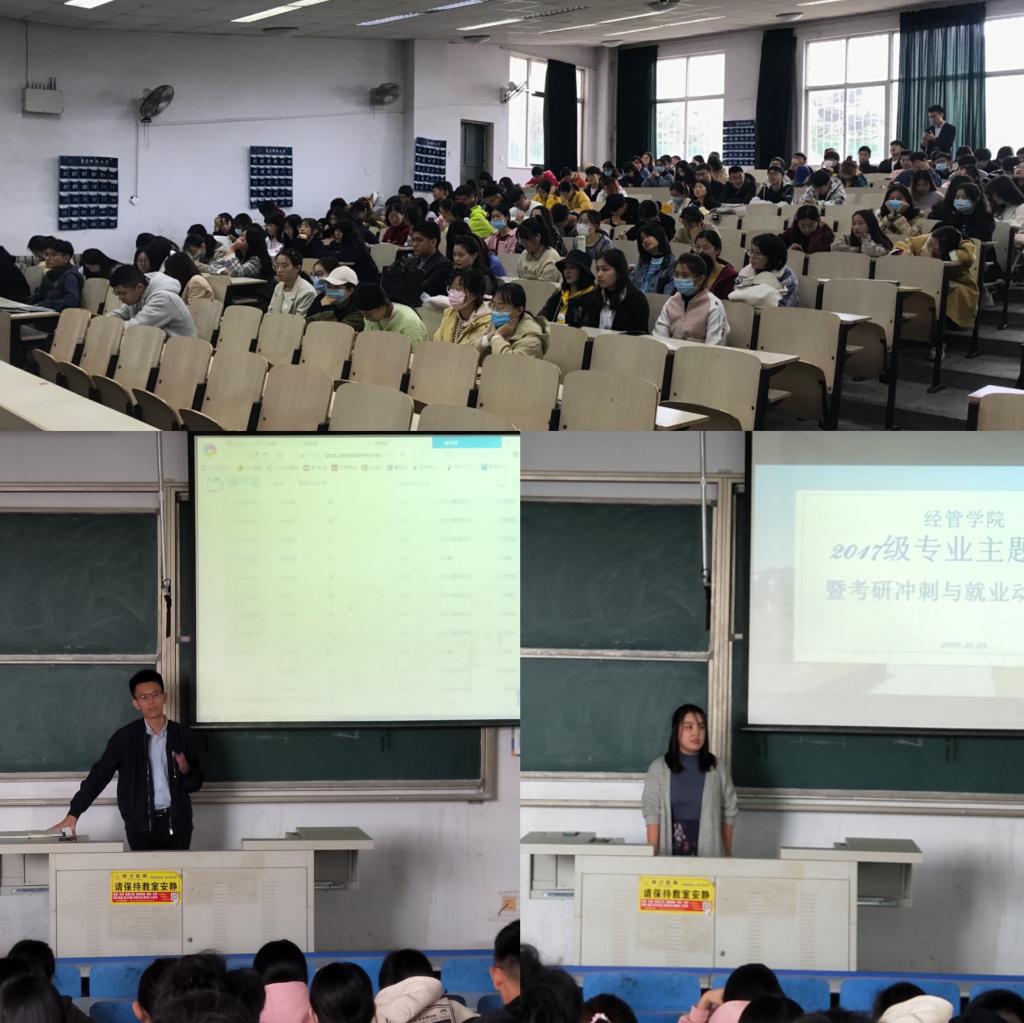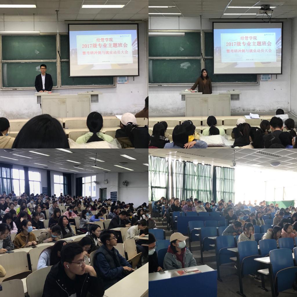 为扎实做好疫情防控常态化下的学生教育管理工作,为学生提供更加精准化服务,2020年10月28日、29日,经管学院于弘毅楼E303、104室分专业召开2017级考研冲刺与就业动员大会。会议由17级辅导员张显全老师、张鸣老师主持,17级全体学生参加。