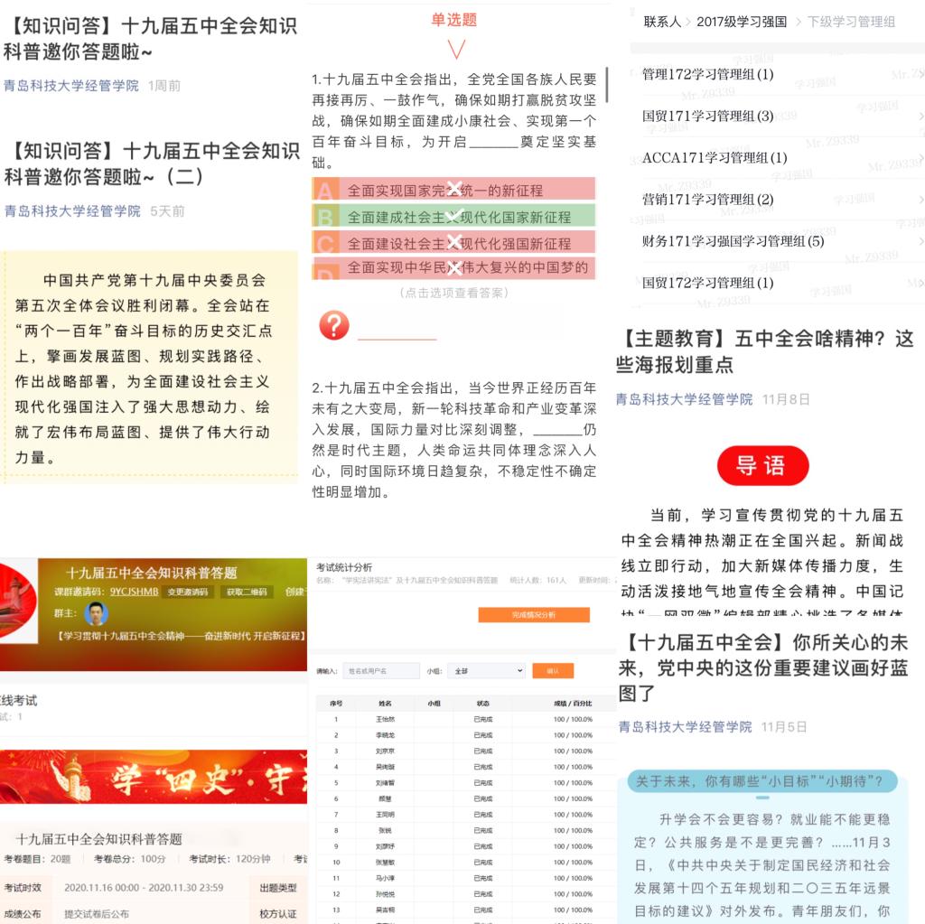 经管学院利用学习强国、学院官网、官微等平台,强化网络育人输出,构建网格化教育格局。利用学习强国班级群实现“联学”,以教师引导与学生自学的方式,把握强国教育资源,深化交流研讨,确保内化于心。利用学院公众号平台实现“点学”,通过推送十九届五中全会“规划蓝图”,发布十九届五中全会热点要闻等系列“主题教育”,引导学生了解全会重点热点,心系发展难点、关注青年工作结合点。利用易班及公众号平台实现“精学”,组织十九届五中全会线上答题竞赛系列活动及“关键词”系列教育,引导学生聚焦全会细节,以喜闻乐见的方式,学细学精全会精神。