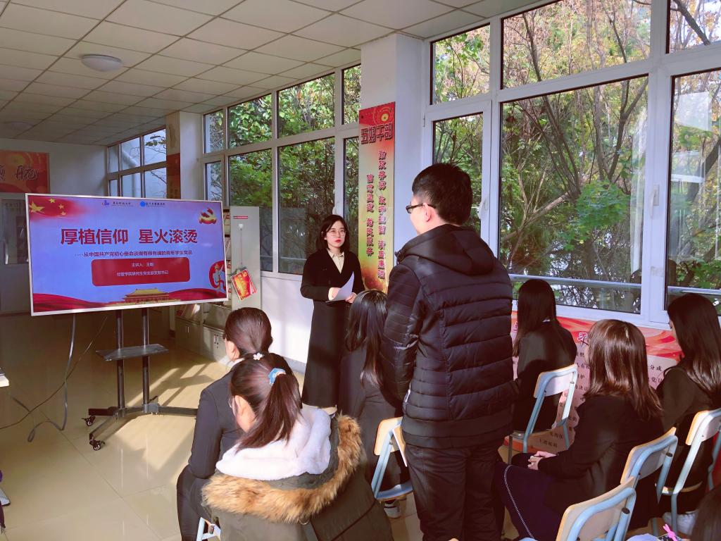 星火汇初心,青春肩使命。经管学院研究生党支部书记王聪以“厚植信仰、星火滚烫”为主题,以十九届五中全会及“四史”教育中红色资源为依托,以“党的旗帜、党的历史、党的擘画”三个方面为切入点,重点阐述了马列主义、毛泽东思想、邓小平理论、“三个代表”重要思想、科学发展观、习近平新时代中国特色社会主义思想等理论内涵,讲述了中国共产党的发展历程和辉煌成就,从中国共产党的初心使命谈做有根有魂的青年学生党员,并在如何提高党性、如何做好党员先锋带头作用、如何将个人发展融入祖国新时代发展建设中做出引导启迪。同时,王聪以浅谈初心使命为契机,激励青年党员加强思想淬炼和政治历练,强化理想信念教育和对党忠诚教育,增强“四个意识”、坚定“四个自信”、做到“两个维护”,在贯彻落实习近平总书记重要讲话、重要批示精神的生动实践中提升新时代党员政治素养、理论水平、专业能力、实践本领。