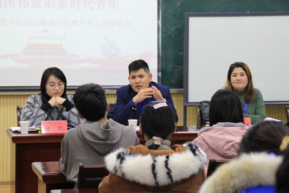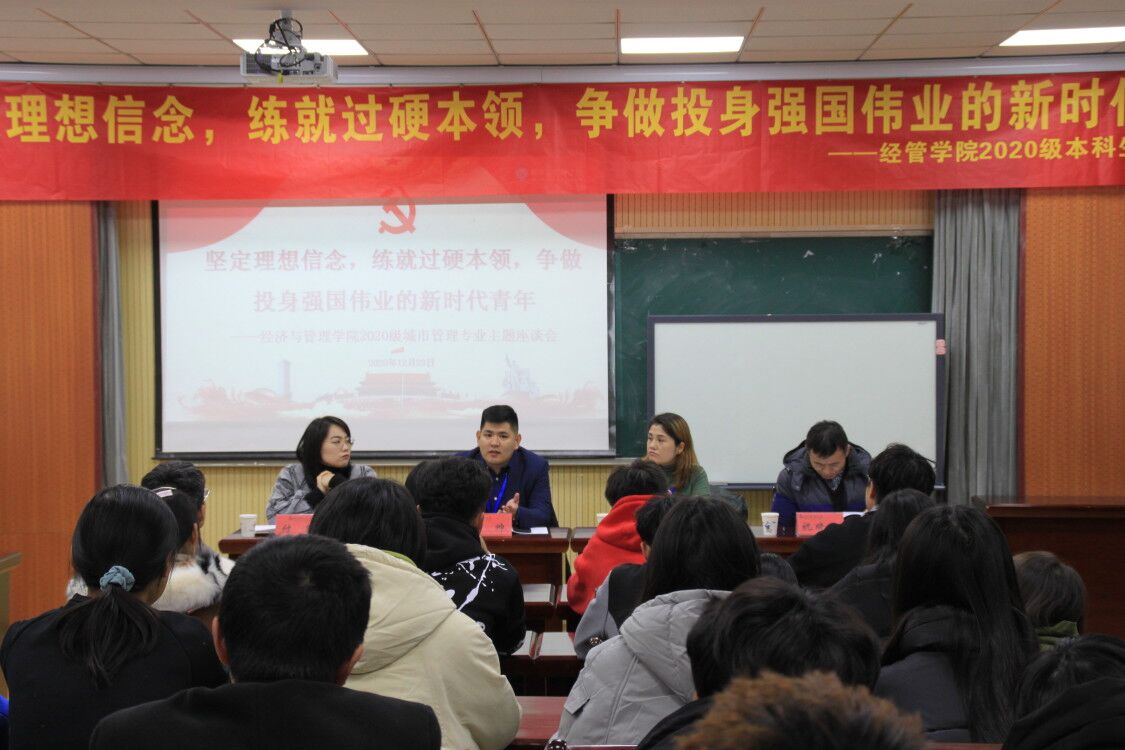 为积极响应学校机关处级干部联系学生班级通知精神,落实立德树人根本任务,进一步提升学生管理水平,促进学生成长成才,12月29日下午,经管学院2020城市管理专业“坚定理想信念,练就过硬本领,争做投身强国伟业的新时代青年”主题座谈会于经管楼419会议室举行,党委(校长)办公室副主任王帅、学生工作处少数民族办公室辅导员热孜亚·茹孜、城市管理专业20级班主任祝晓波出席此次会议,座谈会由20级辅导员付凯主持,城市管理专业全体同学参加。