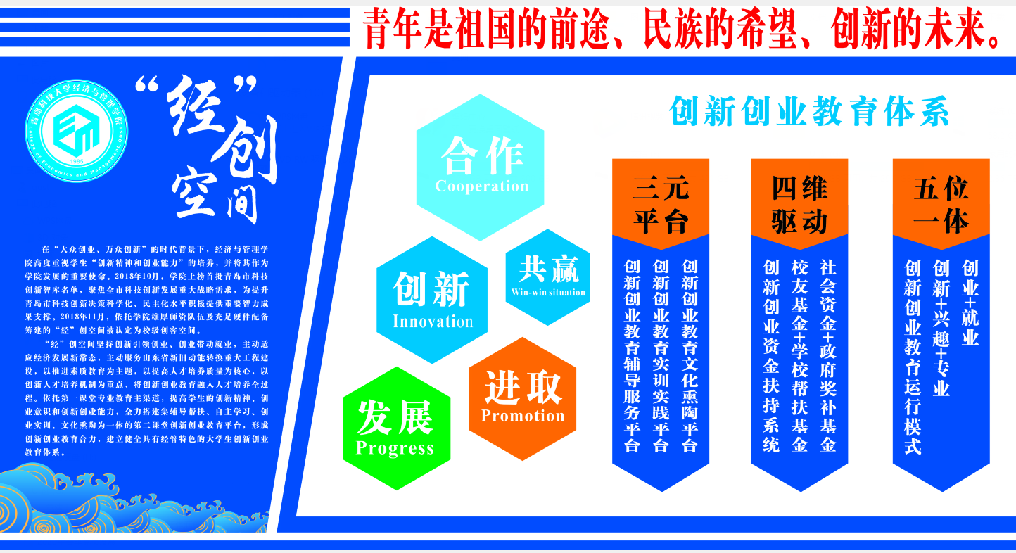 近年来,学院“双创”成绩显著,社会影响力不断增强。2018年10月,学院上榜首批青岛市科技创新智库名单,聚焦全市科技创新发展重大战略需求。同年11月,依托学院雄厚师资队伍及充足硬件配备筹建的“经”创空间被认定为校级创客空间。学生参与双创赛事和活动热情持续提升,学生创新创业能力显著提高。尤其在主体(A、B类)学科竞赛中,省级以上获奖人次逐年稳步增长,2018年-2020年度累计获奖达376人次,学院荣获“创青春”全国铜奖1项,“创青春”MBA专项赛全国铜奖1项。“三创赛”全国一等奖1项、二等奖2项、最佳创新奖1项,山东省“创青春”金奖1项,山东省“挑战杯”三等奖3项,累计获批国家级大学生创新创业立项3项,省级大学生创新创业立项4项,校级大学生创新创业立项40项。在学校2019学科竞赛排位前10名的专业中,学院工业工程专业、物流管理专业的生均学科竞赛获奖项数超过10%,位列全校前两位。在创新创业教育工作年度考核中,连续两年考核结果优秀,连续三年文科学院排名第一。创新创业工作的良性发展有效提升了学生就业工作质量,2018-2020年学院毕业生就业率在人文社科类学院中排名第一。