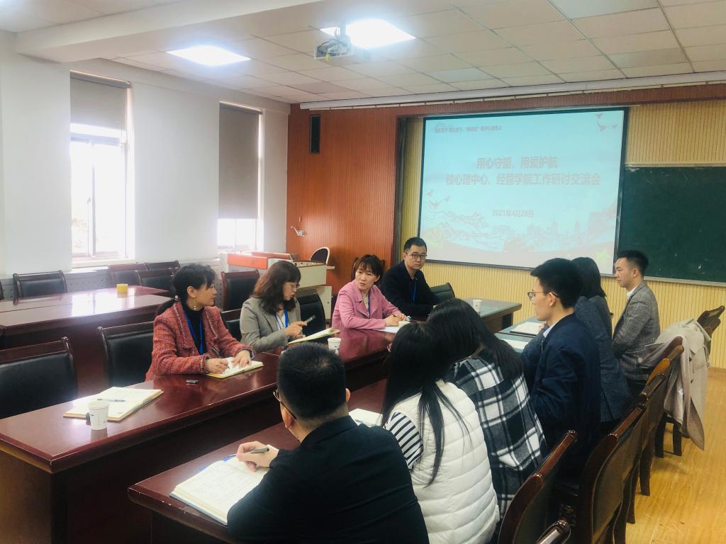 为“精细化”做好心理育人,坚持真情教育,热心服务,4月28日上午,学生处心理中心、经管学院工作研讨交流会在经管楼419举行,学生处副处长王丽出席会议,心理中心主任李海玲,心理中心魏玉杰、王岳飞,经管学院党委副书记兼副院长刘跃宁及全体辅导员参加了座谈。