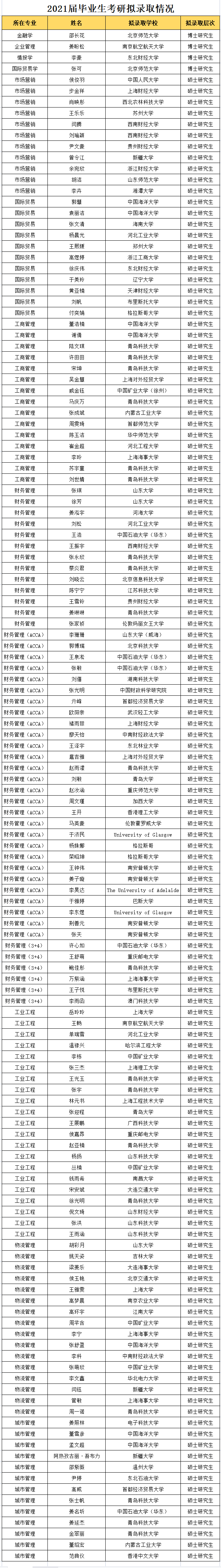 2021年全国硕士研究生录取工作接近尾声,在学院领导和老师的关心、指导以及同学们的不懈努力下,经管学院捷报频传,截至目前,学院2021届硕士研究生有4人成功考取博士研究生,2021届本科生中有134人被中国人民大学、山东大学、上海财经大学等知名高校录取为硕士研究生,本科生总体升学率达26.43%(国内升学率22.68%)。升学录取名单如下: